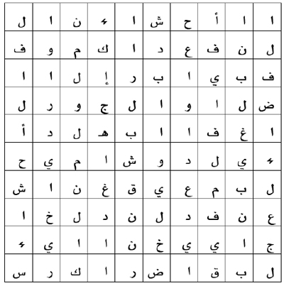اشطب على كلمات بيتي الشعر داخل المربع واستخرج كلمة السرّ المكوَّنة من (١٢) حرفاً، وهي عبارة عن اسم المكان الذي تكون منه انطلاقة السفياني والذي يقع في حدود الأردن وسورية.