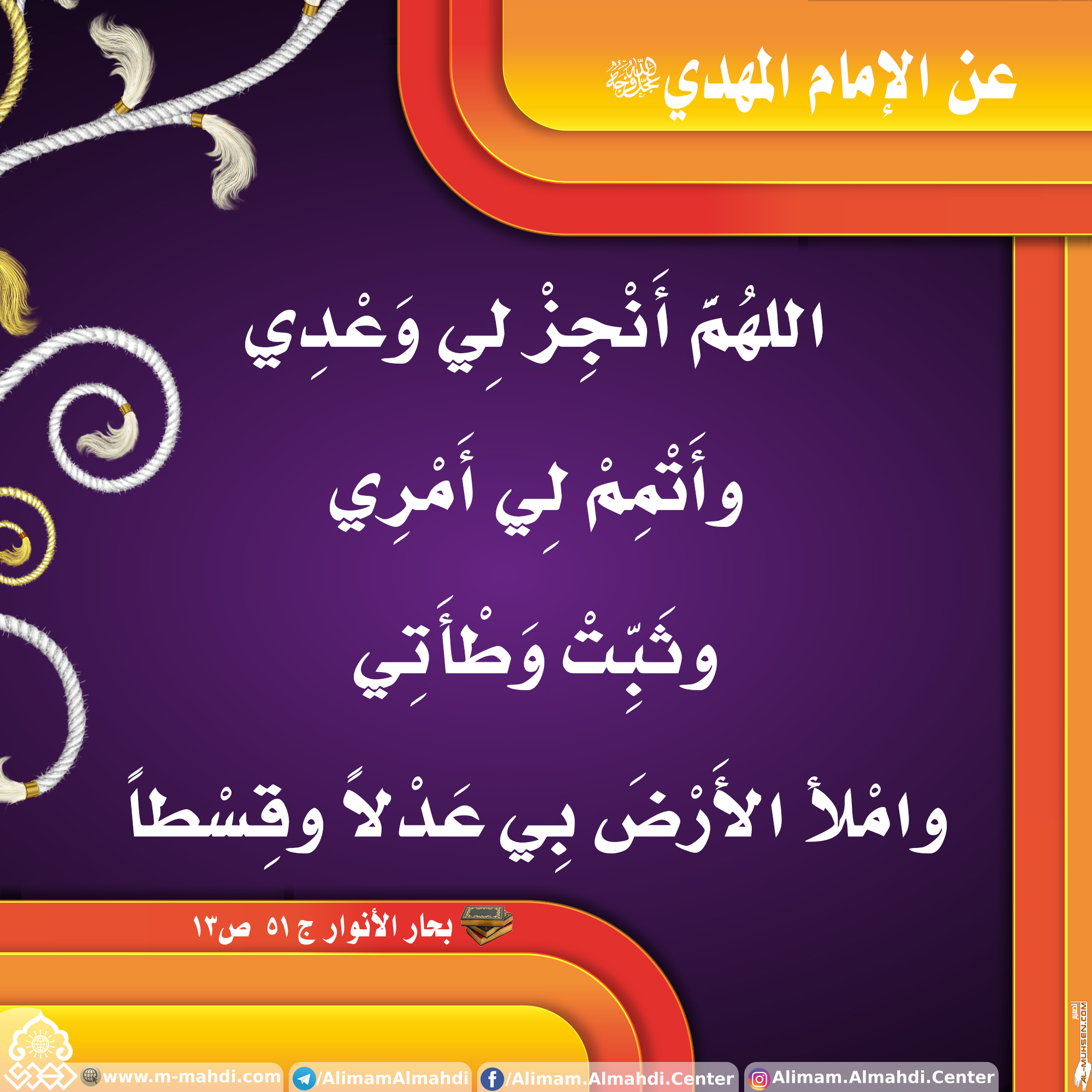 اَللّـهُمَّ كُنْ لِوَلِيِّكَ الْحُجَّةِ بْنِ الْحَسَنِ صَلَواتُكَ عَلَيْهِ وَعَلى آبائِه في هذِهِ السَّاعَةِ وَفي كُلِّ ساعَة وَلِيّاً وَحافِظاً وَقائِداً وَناصِراً وَدَليلاً وَعَيْنا حَتّى تُسْكِنَهُ اَرْضَكَ طَوْعاً وَتُمَتِّعَهُ فيها طَويلاً