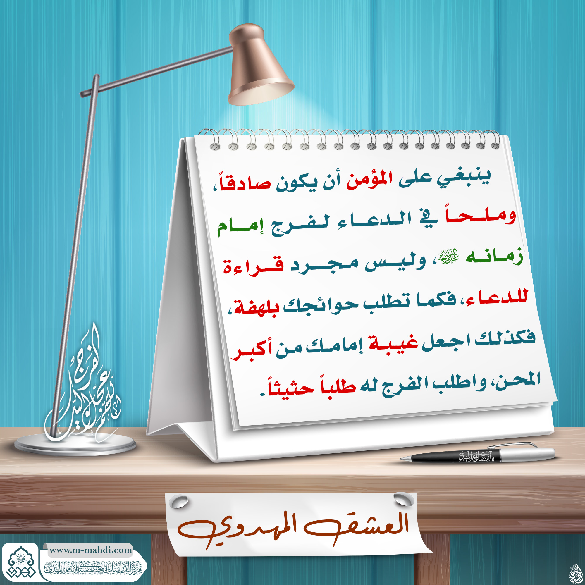 اَللّـهُمَّ كُنْ لِوَلِيِّكَ الْحُجَّةِ بْنِ الْحَسَنِ صَلَواتُكَ عَلَيْهِ وَعَلى آبائِه في هذِهِ السَّاعَةِ وَفي كُلِّ ساعَة وَلِيّاً وَحافِظاً وَقائِداً وَناصِراً وَدَليلاً وَعَيْنا حَتّى تُسْكِنَهُ اَرْضَكَ طَوْعاً وَتُمَتِّعَهُ فيها طَويلاً