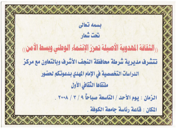 في خضم الأحداث المتوالية في ربوع عراقنا الحبيب على الصعيد السياسي والاقتصادي والفكري وانفتاح الساحة العراقية على الكثير من الافكار، مما انتج بروز تيارات فكرية منحرفة تتخذ من السلاح واهدار الدماء وسيلة لتحقيق اطروحاتها الفكرية كان لابد للمؤسسات الحكومية من الوقوف امامها وهذا ما بادر إليه مركز الدراسات التخصصية في الامام المهدي عليه السلام ليكون الرائد في مجال مكافحة الإرهاب الفكري وذلك بإقامة الملتقى الثقافي الأول تحت شعار (الثقافة المهدوية الأصيلة تعزز الانتماء الوطني وبسط الأمن) وذلك بالتعاون والتنسيق مع مديرية شرطة محافظة النجف الأشرف.