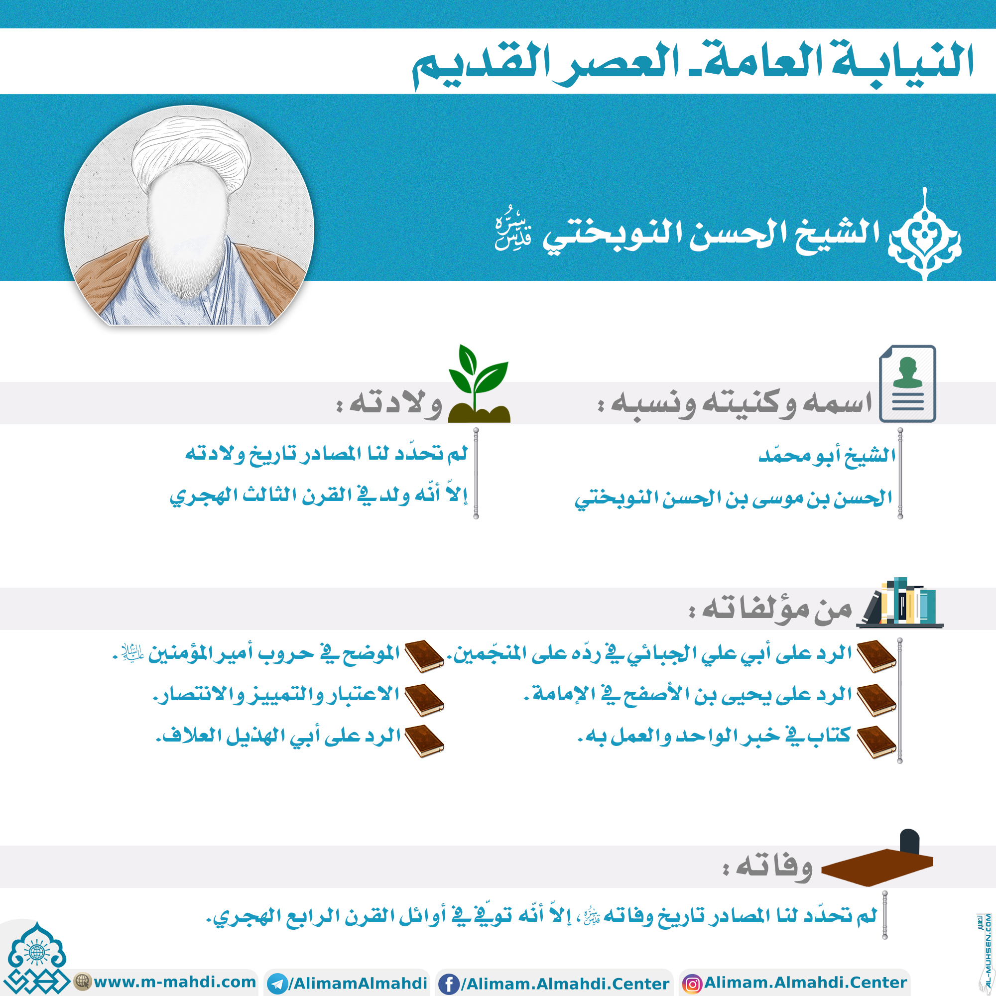 ?الشيخ الحسن النوبختي (قدس سره) ?اسمه وكنيته ونسبه: الشيخ أبو محمّد الحسن بن موسى بن الحسن النوبختي. ?ولادته: لم تحدّد لنا المصادر تاريخ ولادته إلاّ أنّه ولد في القرن الثالث الهجري. ?من مؤلفاته: ? الرد على أبي علي الجبائي في ردّه على المنجّمين. ? الموضح في حروب أمير المؤمنين (عليه السلام).…