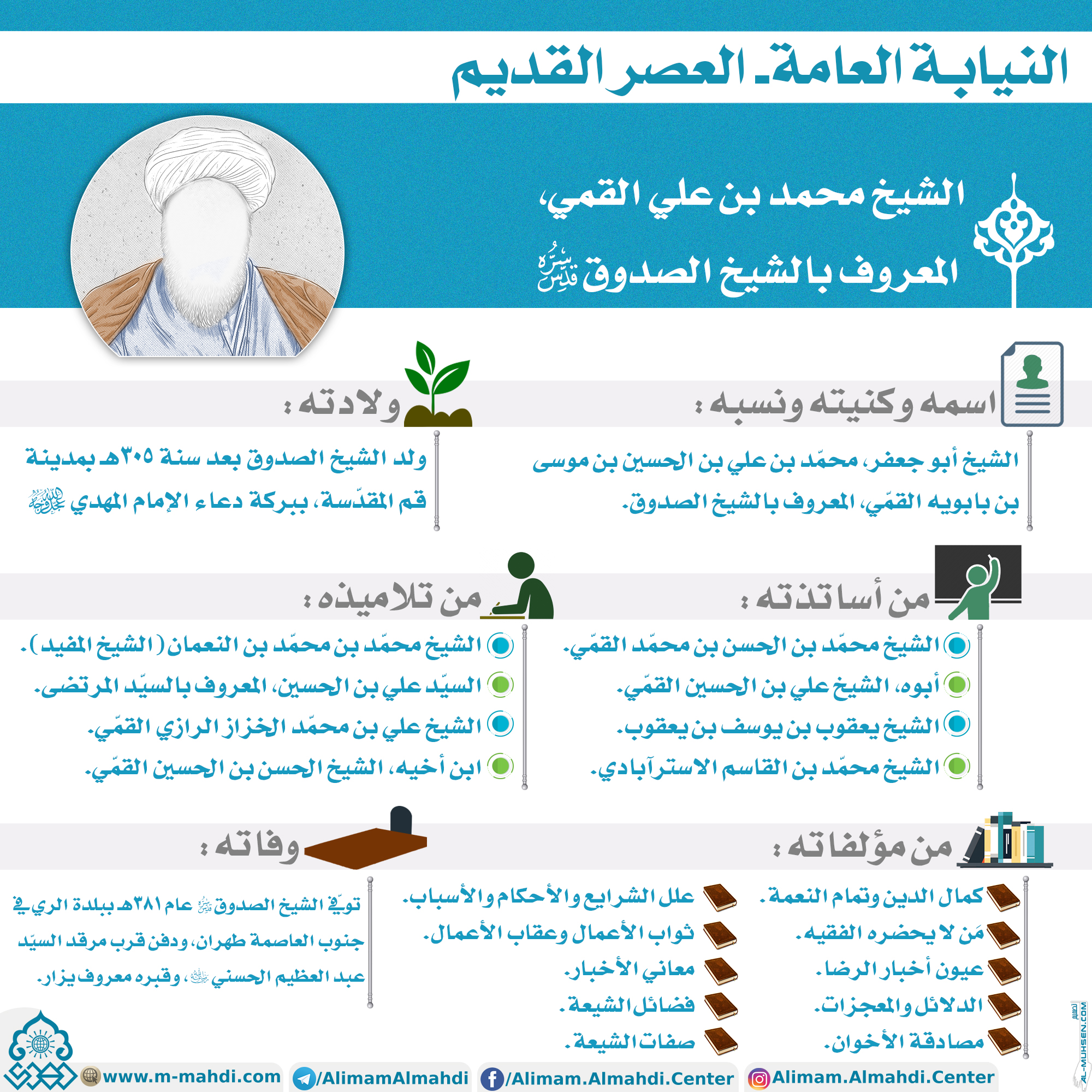 ?الشيخ محمد بن علي القمي، المعروف بالشيخ الصدوق (قدس سره) ?اسمه وكنيته ونسبه: الشيخ أبو جعفر، محمّد بن علي بن الحسين بن موسى بن بابويه القمّي، المعروف بالشيخ الصدوق. ?ولادته: ولد الشيخ الصدوق بعد سنة ٣٠٥هـ بمدينة قم المقدّسة، ببركة دعاء الإمام المهدي (عجّل الله فرجه). ?من أساتذته: -…