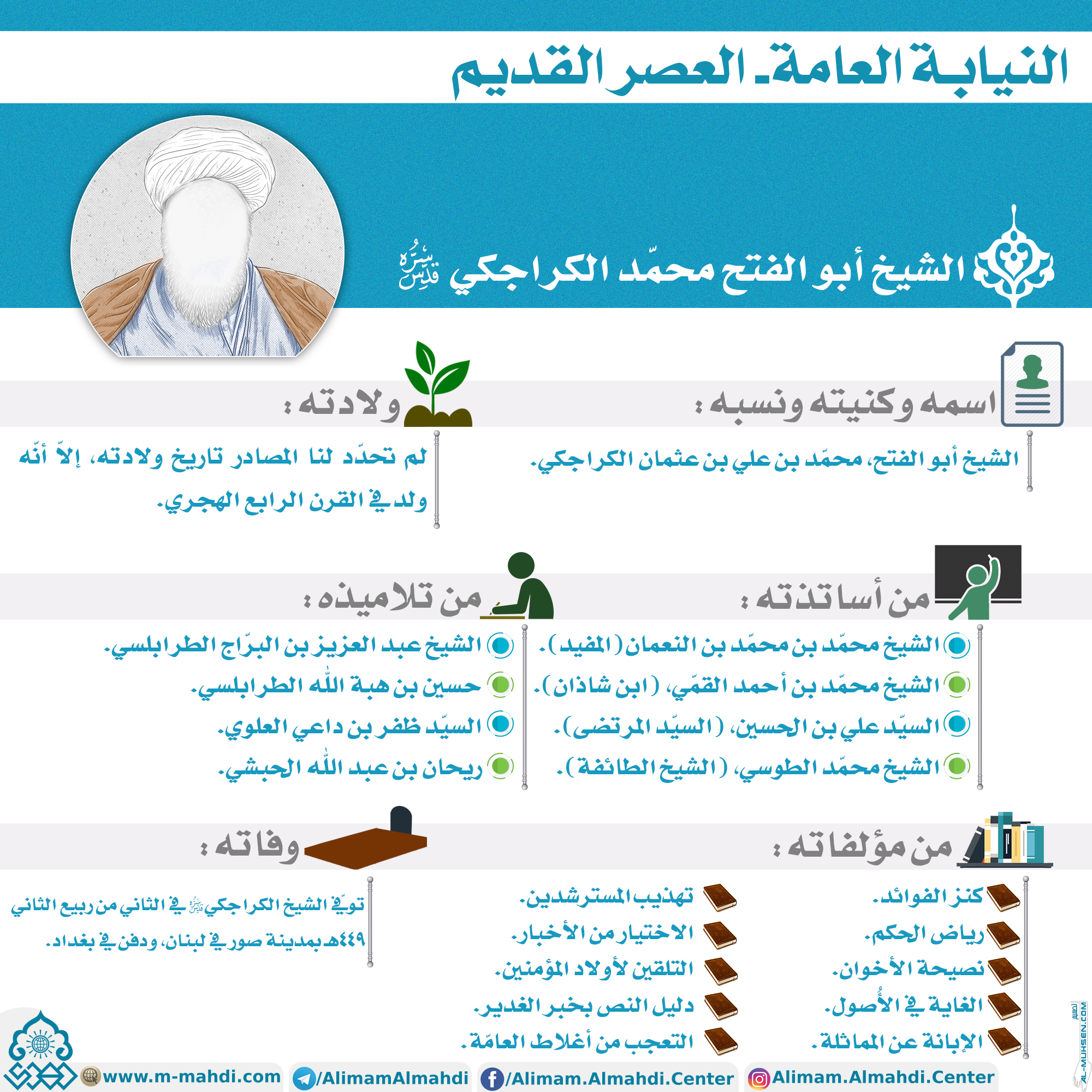 ?الشيخ أبو الفتح محمّد الكراجكي (قدس سره) ?اسمه وكنيته ونسبه: الشيخ أبو الفتح، محمّد بن علي بن عثمان الكراجكي. ?ولادته: لم تحدّد لنا المصادر تاريخ ولادته، إلاّ أنّه ولد في القرن الرابع الهجري. ?من أساتذته: - الشيخ محمّد بن محمّد بن النعمان(المفيد). - الشيخ محمّد بن أحمد القمّي، (ابن…