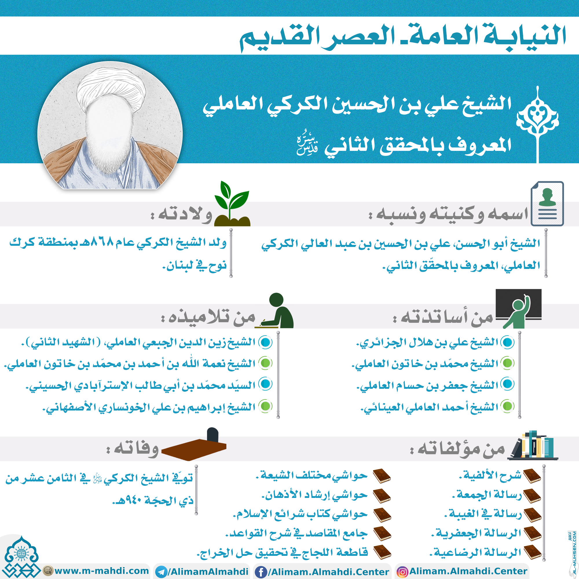?الشيخ علي بن الحسين الكركي العاملي المعروف بالمحقق الثاني (قدس سره) ?اسمه وكنيته ونسبه: الشيخ أبو الحسن، علي بن الحسين بن عبد العالي الكركي العاملي، المعروف بالمحقّق الثاني. ?ولادته: ولد الشيخ الكركي عام ٨٦٨هـ بمنطقة كرك نوح في لبنان. ?من أساتذته: - الشيخ علي بن هلال الجزائري. - الشيخ…