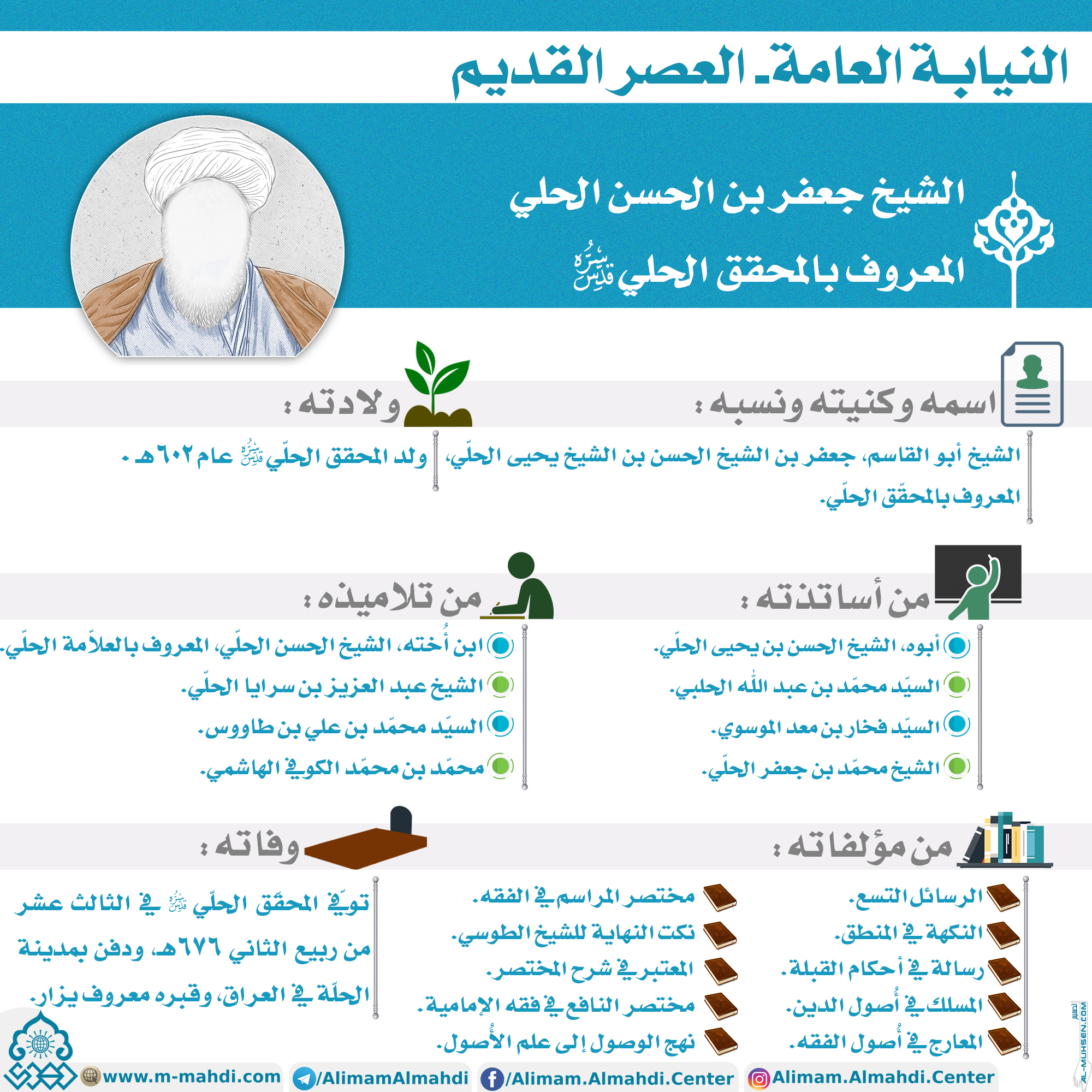 ?الشيخ جعفر بن الحسن الحلي المعروف بالمحقق الحلي (قدس سره) ?اسمه وكنيته ونسبه: الشيخ أبو القاسم، جعفر بن الشيخ الحسن بن الشيخ يحيى الحلّي، المعروف بالمحقّق الحلّي. ?ولادته: ولد المحقق الحلّي (قدس سره) عام ٦٠٢هـ . ?من أساتذته: - أبوه، الشيخ الحسن بن يحيى الحلّي. - السيّد محمّد بن عبد الله…