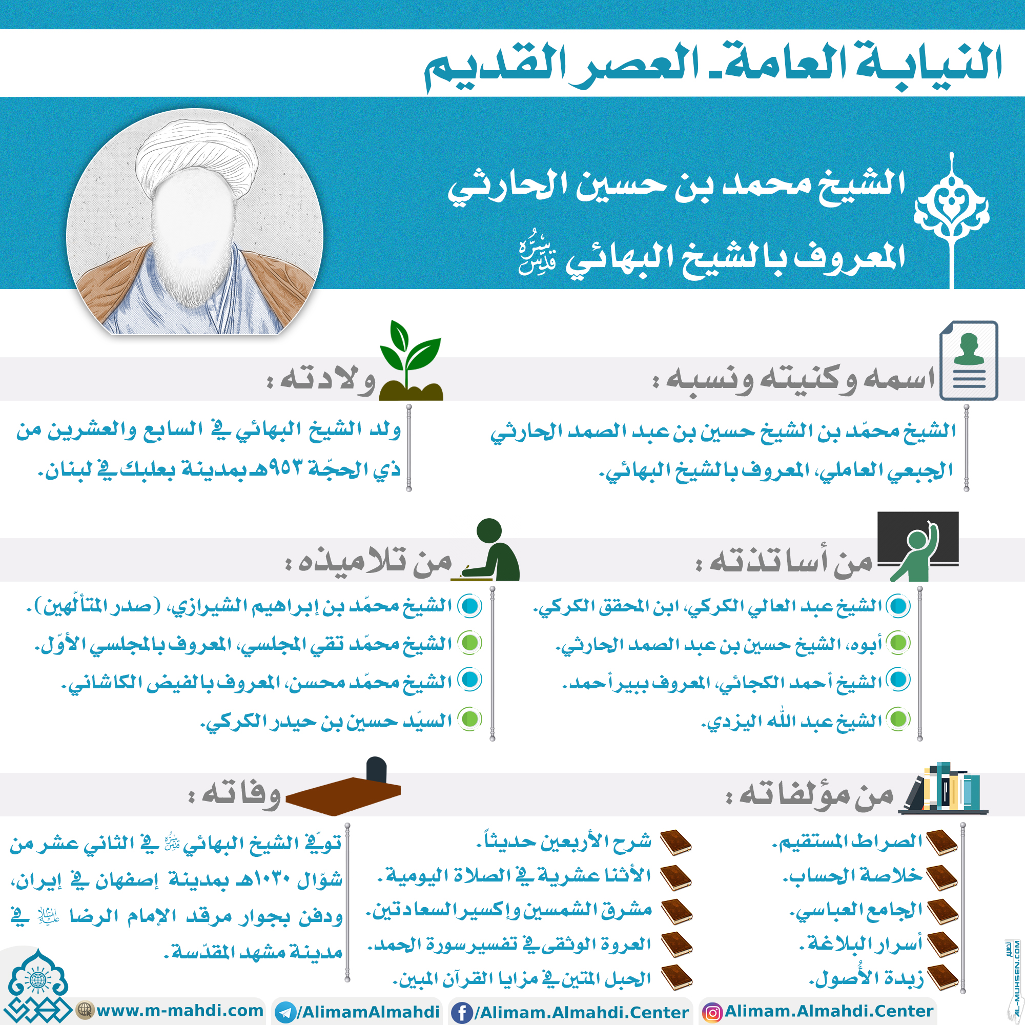 ?الشيخ محمد بن حسين الحارثي المعروف بالشيخ البهائي (قدس سره) ?اسمه وكنيته ونسبه: الشيخ محمّد بن الشيخ حسين بن عبد الصمد الحارثي الجبعي العاملي، المعروف بالشيخ البهائي. ?ولادته: ولد الشيخ البهائي في السابع والعشرين من ذي الحجّة ٩٥٣هـ بمدينة بعلبك في لبنان. ?من أساتذته: - الشيخ عبد العالي…