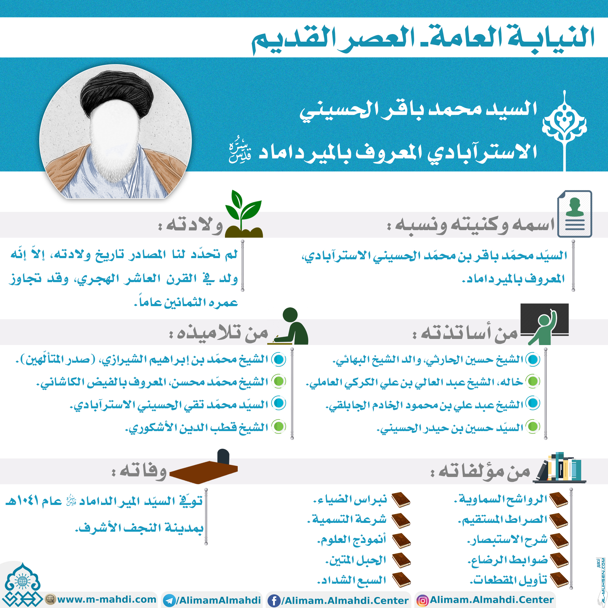 ?السيد محمد باقر الحسيني الاسترآبادي المعروف بالمير داماد (قدس سره) ?اسمه وكنيته ونسبه: السيّد محمّد باقر بن محمّد الحسيني الاسترآبادي، المعروف بالمير داماد. ?ولادته: لم تحدّد لنا المصادر تاريخ ولادته، إلاّ إنّه ولد في القرن العاشر الهجري، وقد تجاوز عمره الثمانين عاماً. ?من أساتذته:…
