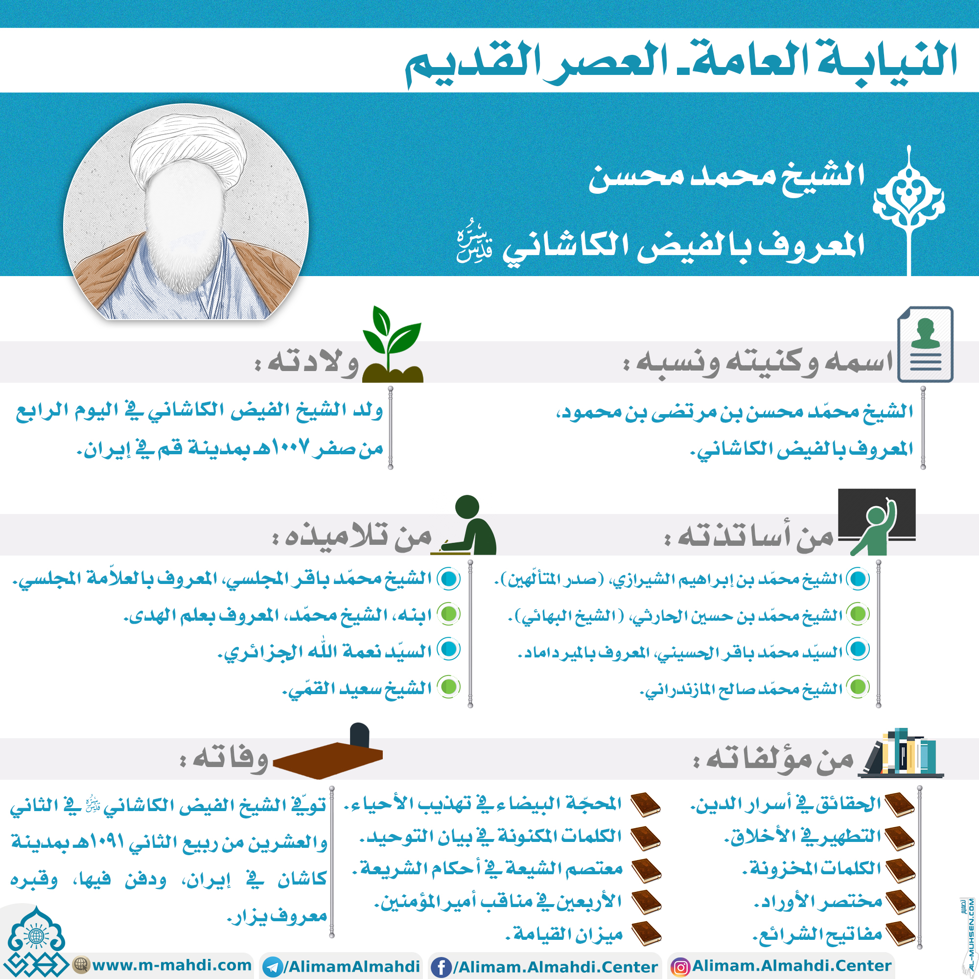 ?الشيخ محمد محسن المعروف بالفيض الكاشاني (قدس سره) ?اسمه وكنيته ونسبه: الشيخ محمّد محسن بن مرتضى بن محمود، المعروف بالفيض الكاشاني. ?ولادته: ولد الشيخ الفيض الكاشاني في اليوم الرابع من صفر ١٠٠٧هـ بمدينة قم في إيران. ?من أساتذته: - الشيخ محمّد بن إبراهيم الشيرازي، (صدر المتألّهين). -…