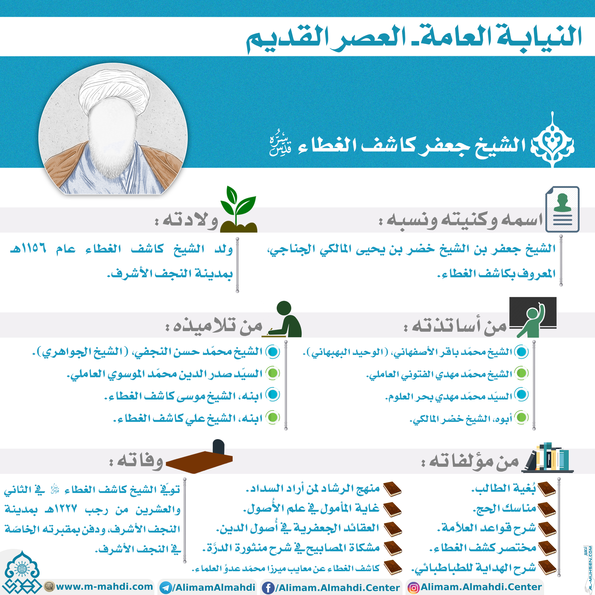 ?الشيخ جعفر كاشف الغطاء (قدس سره) ?اسمه وكنيته ونسبه: الشيخ جعفر بن الشيخ خضر بن يحيى المالكي الجناجي، المعروف بكاشف الغطاء. ?ولادته: ولد الشيخ كاشف الغطاء عام ١١٥٦هـ بمدينة النجف الأشرف. ?من أساتذته: - الشيخ محمّد باقر الأصفهاني، (الوحيد البهبهاني). - الشيخ محمّد مهدي الفتوني العاملي.…
