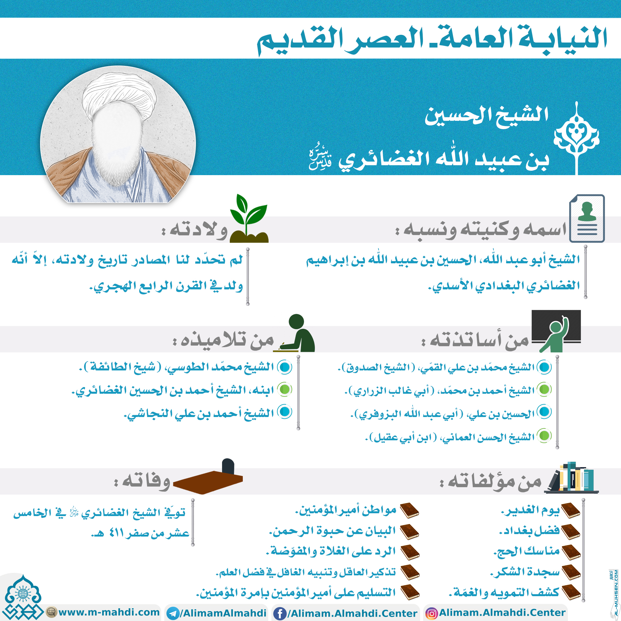 ?الشيخ الحسين بن عبيد الله الغضائري (قدس سره) ?اسمه وكنيته ونسبه: الشيخ أبو عبد الله، الحسين بن عبيد الله بن إبراهيم الغضائري البغدادي الأسدي. ?ولادته: لم تحدّد لنا المصادر تاريخ ولادته، إلاّ أنّه ولد في القرن الرابع الهجري. ?من أساتذته: - الشيخ محمّد بن علي القمّي، (الشيخ الصدوق).…