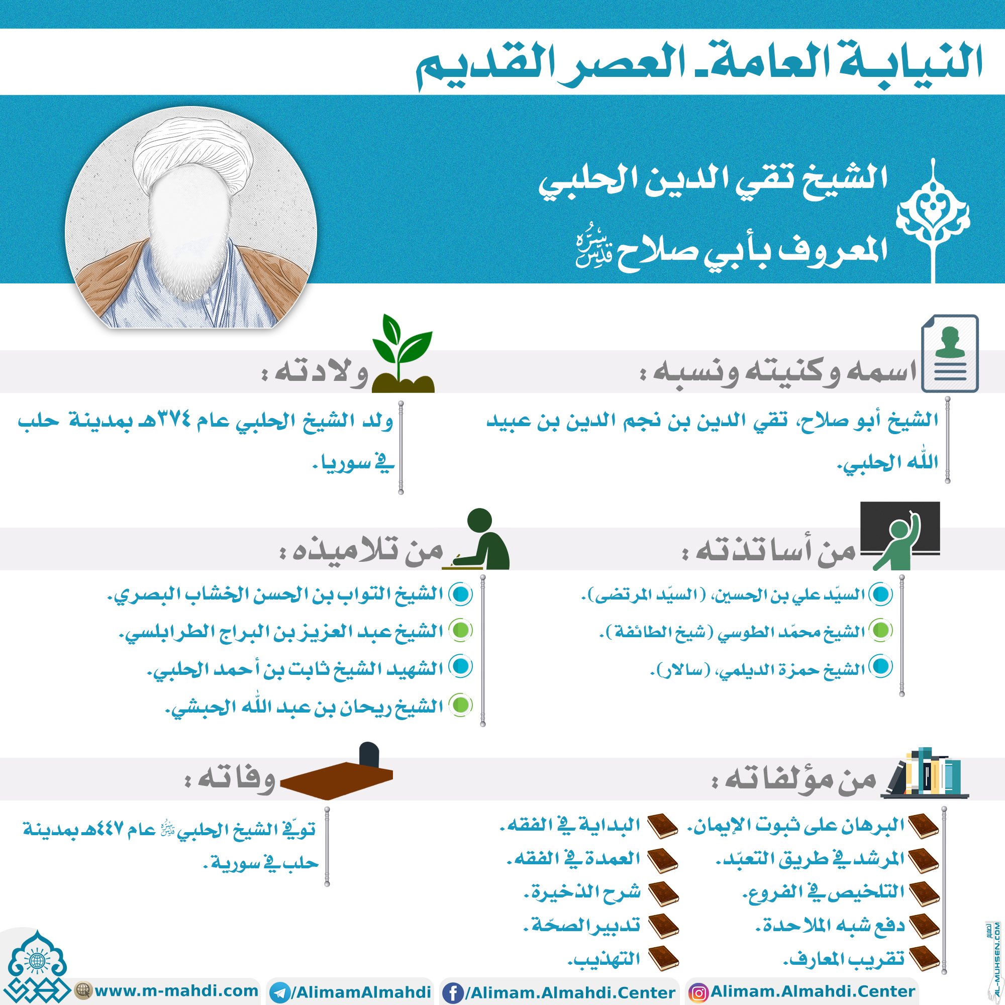 ?الشيخ تقي الدين الحلبي المعروف بأبي صلاح (قدس سره) ?اسمه وكنيته ونسبه: الشيخ أبو صلاح، تقي الدين بن نجم الدين بن عبيد الله الحلبي. ?ولادته: ولد الشيخ الحلبي عام ٣٧٤هـ بمدينة حلب في سوريا. ?من أساتذته: - السيّد علي بن الحسين، (السيّد المرتضى). - الشيخ محمّد الطوسي (شيخ الطائفة). - الشيخ…