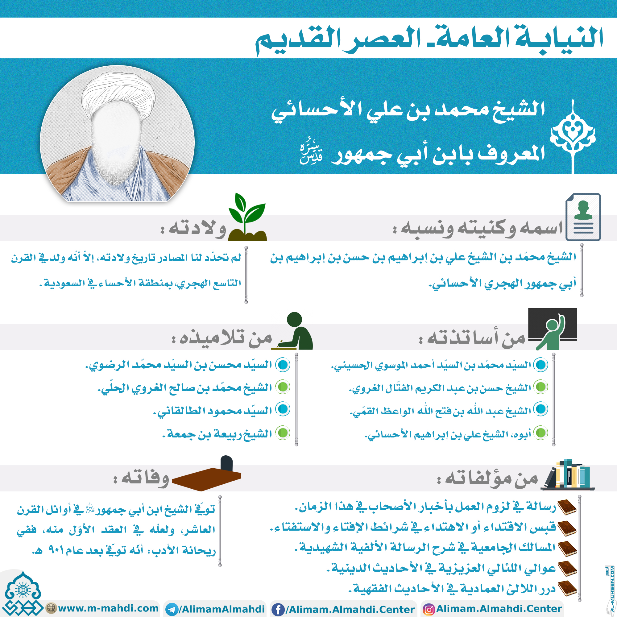 ?الشيخ محمد بن علي الأحسائي المعروف بابن أبي جمهور (قدس سره) ?اسمه وكنيته ونسبه: الشيخ محمّد بن الشيخ علي بن إبراهيم بن حسن بن إبراهيم بن أبي جمهور الهجري الأحسائي. ?ولادته: لم تحدّد لنا المصادر تاريخ ولادته، إلاّ أنّه ولد في القرن التاسع الهجري، بمنطقة الأحساء في السعودية. ?من أساتذته:…