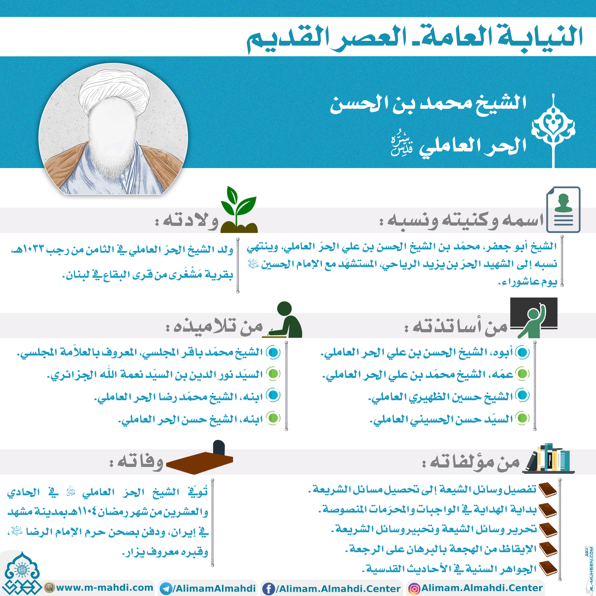 ?الشيخ محمد بن الحسن الحر العاملي (قدس سره) ?اسمه وكنيته ونسبه: الشيخ أبو جعفر، محمّد بن الشيخ الحسن بن علي الحرّ العاملي، وينتهي نسبه إلى الشهيد الحرّ بن يزيد الرياحي، المستشهَد مع الإمام الحسين (عليه السلام) يوم عاشوراء. ?ولادته: ولد الشيخ الحرّ العاملي في الثامن من رجب ١٠٣٣هـ، بقرية…