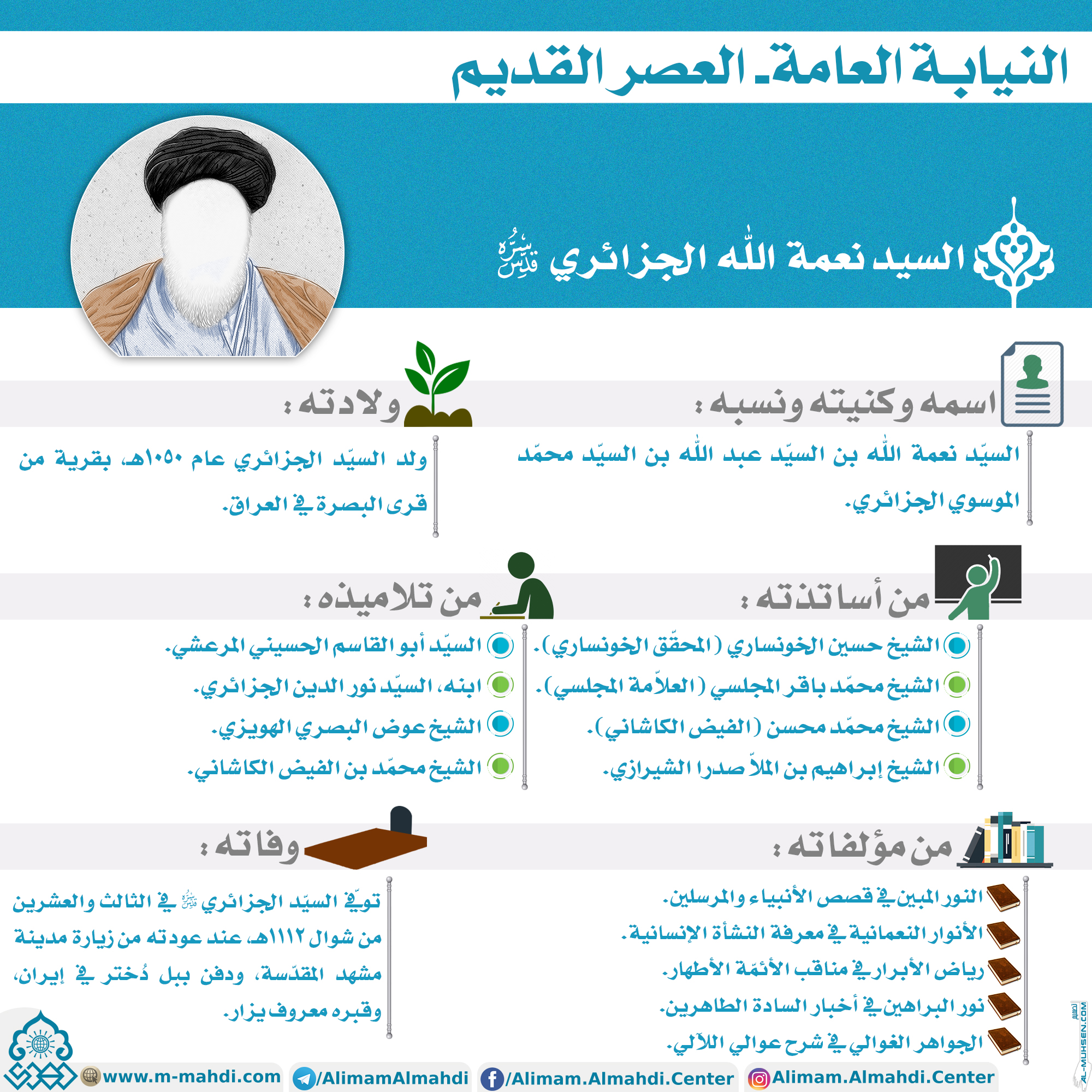 ?السيد نعمة الله الجزائري (قدس سره) ?اسمه وكنيته ونسبه: السيّد نعمة الله بن السيّد عبد الله بن السيّد محمّد الموسوي الجزائري. ?ولادته: ولد السيّد الجزائري عام ١٠٥٠هـ، بقرية من قرى البصرة في العراق. ?من أساتذته: - الشيخ حسين الخونساري (المحقّق الخونساري). - الشيخ محمّد باقر المجلسي (العلاّمة…