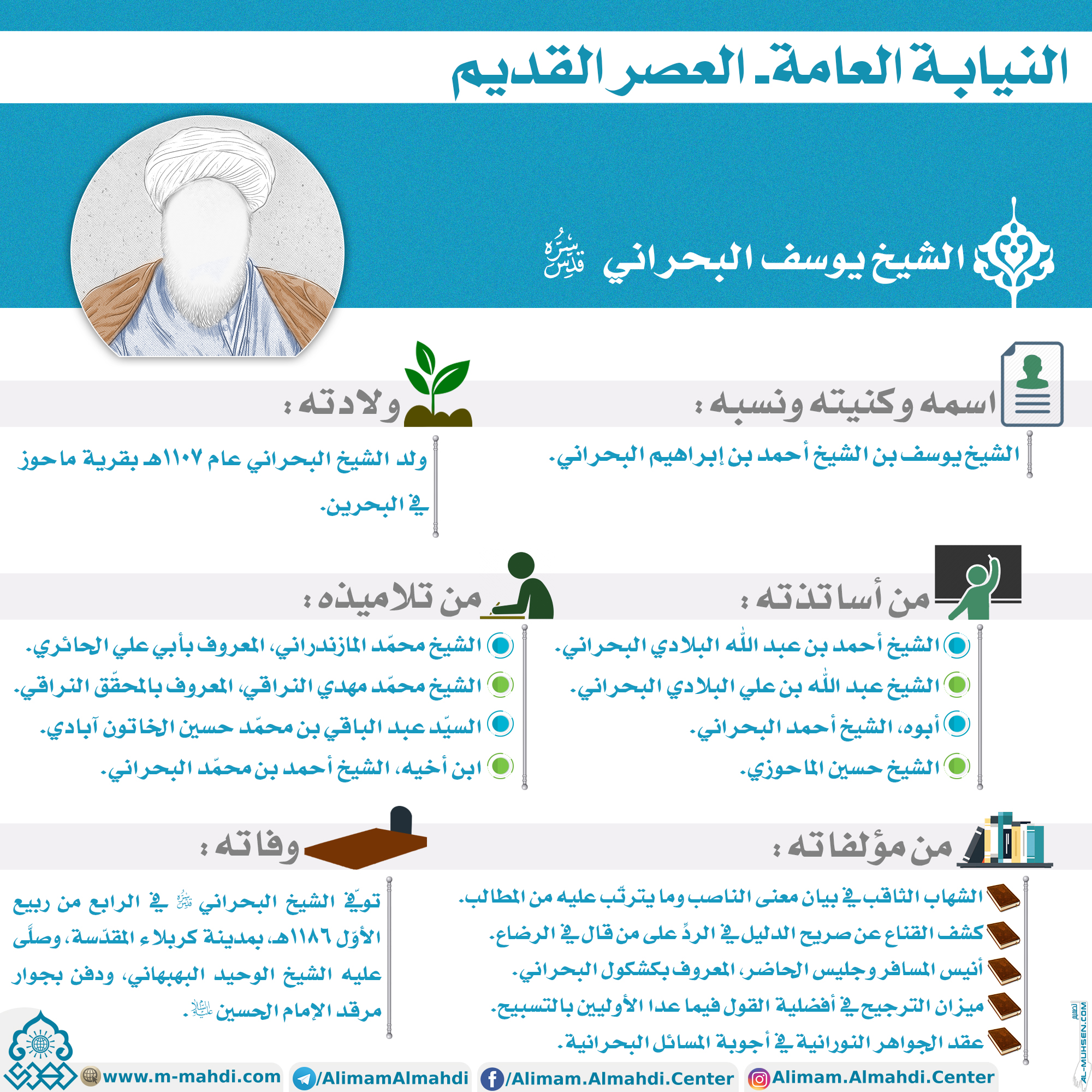 ?الشيخ يوسف البحراني (قدس سره) ?اسمه وكنيته ونسبه: الشيخ يوسف بن الشيخ أحمد بن إبراهيم البحراني. ?ولادته: ولد الشيخ البحراني عام ١١٠٧هـ بقرية ماحوز في البحرين. ?من أساتذته: - الشيخ أحمد بن عبد الله البلادي البحراني. - الشيخ عبد الله بن علي البلادي البحراني. - أبوه، الشيخ أحمد البحراني.…