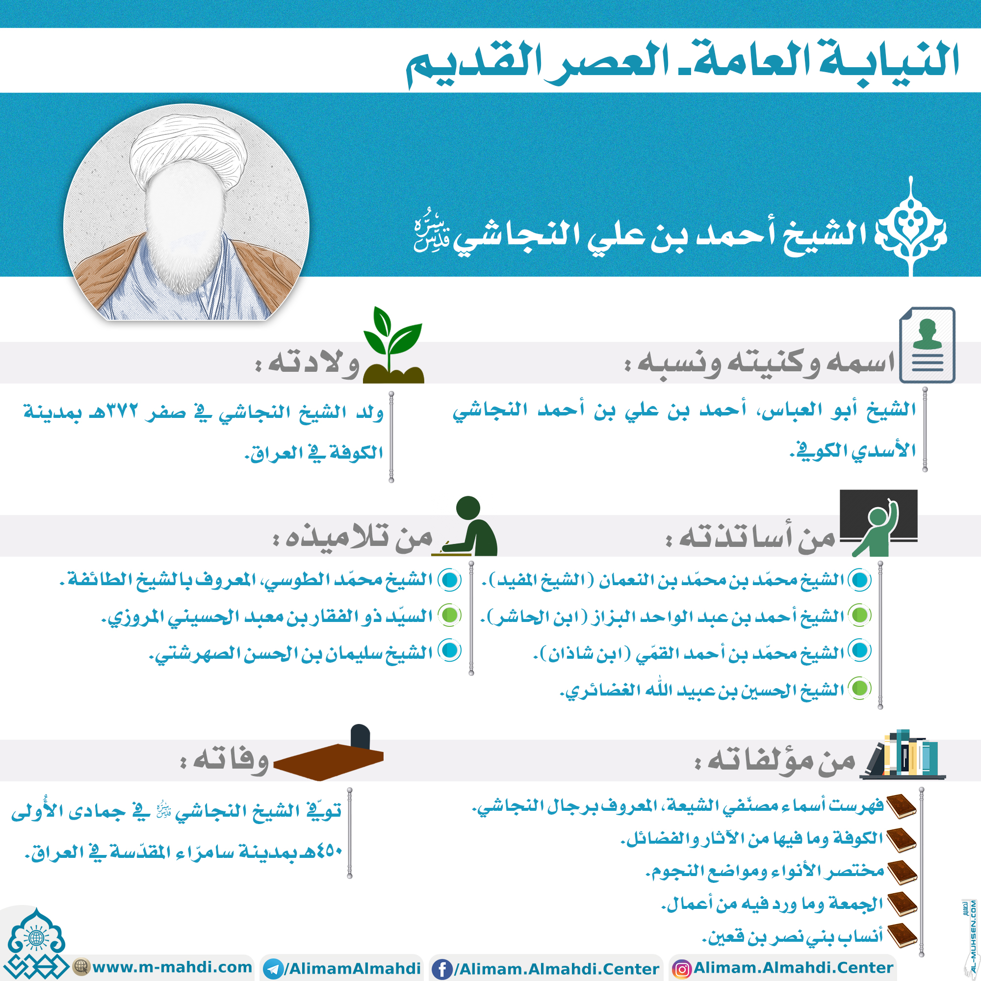 ?الشيخ أحمد بن علي النجاشي (قدس سره) ?اسمه وكنيته ونسبه: الشيخ أبو العباس، أحمد بن علي بن أحمد النجاشي الأسدي الكوفي. ?ولادته: ولد الشيخ النجاشي في صفر ٣٧٢هـ بمدينة الكوفة في العراق. ?من أساتذته: - الشيخ محمّد بن محمّد بن النعمان (الشيخ المفيد). - الشيخ أحمد بن عبد الواحد البزاز (ابن الحاشر).…