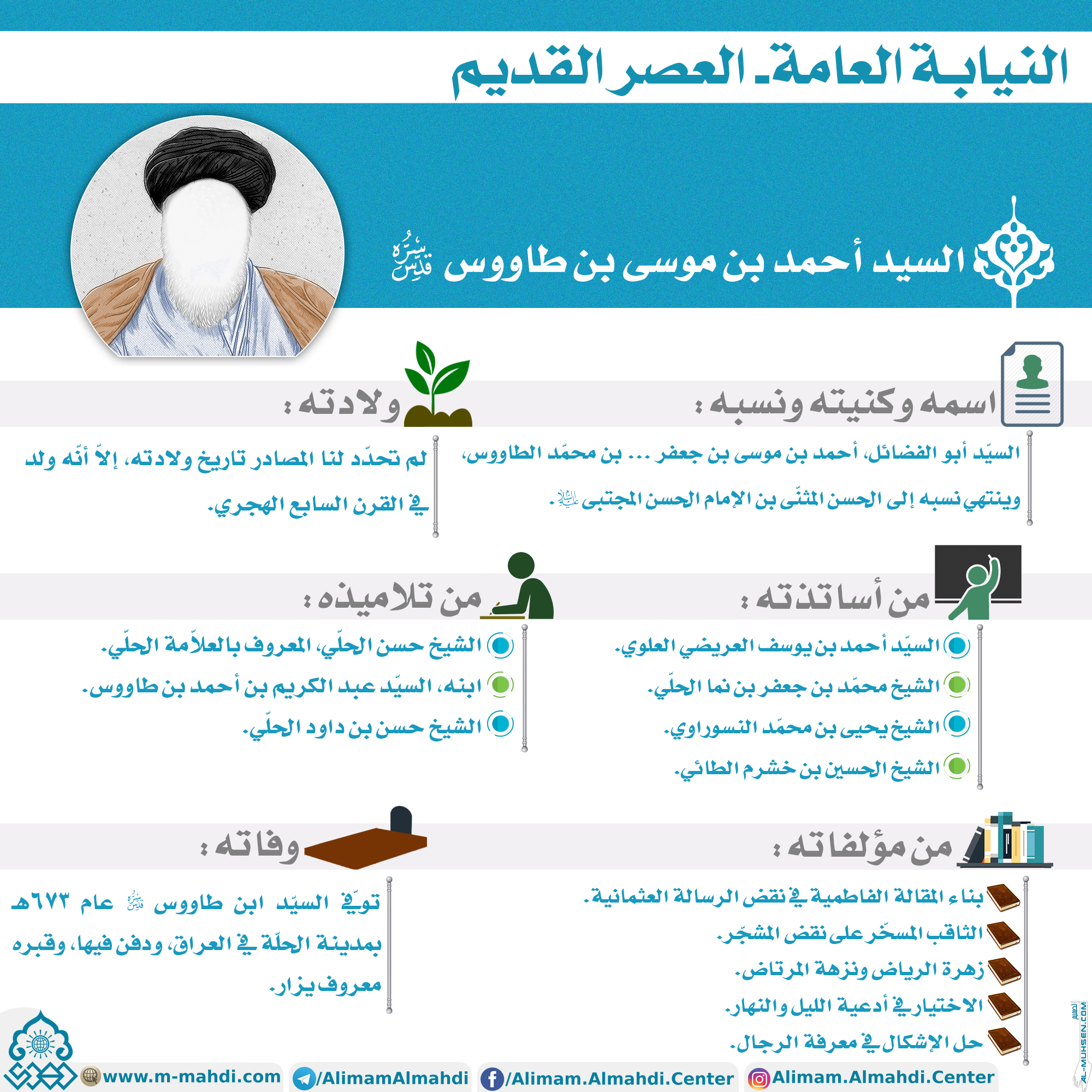 ?السيد أحمد بن موسى بن طاووس (قدس سره) ?اسمه وكنيته ونسبه: السيّد أبو الفضائل، أحمد بن موسى بن جعفر ... بن محمّد الطاووس، وينتهي نسبه إلى الحسن المثنّى بن الإمام الحسن المجتبى (عليه السلام). ?ولادته: لم تحدّد لنا المصادر تاريخ ولادته، إلاّ أنّه ولد في القرن السابع الهجري. ?من أساتذته:…