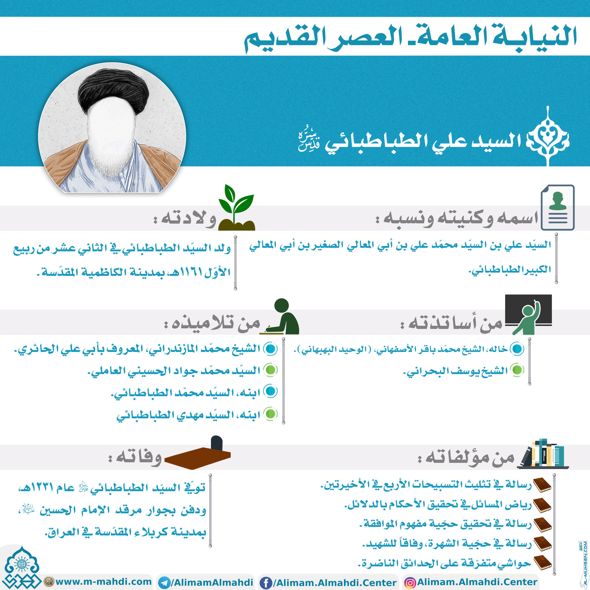 ?السيد علي الطباطبائي (قدس سره) ?اسمه وكنيته ونسبه: السيّد علي بن السيّد محمّد علي بن أبي المعالي الصغير بن أبي المعالي الكبير الطباطبائي. ?ولادته: ولد السيّد الطباطبائي في الثاني عشر من ربيع الأوّل ١١٦١هـ، بمدينة الكاظمية المقدّسة. ?من أساتذته: - خاله، الشيخ محمّد باقر الأصفهاني،…