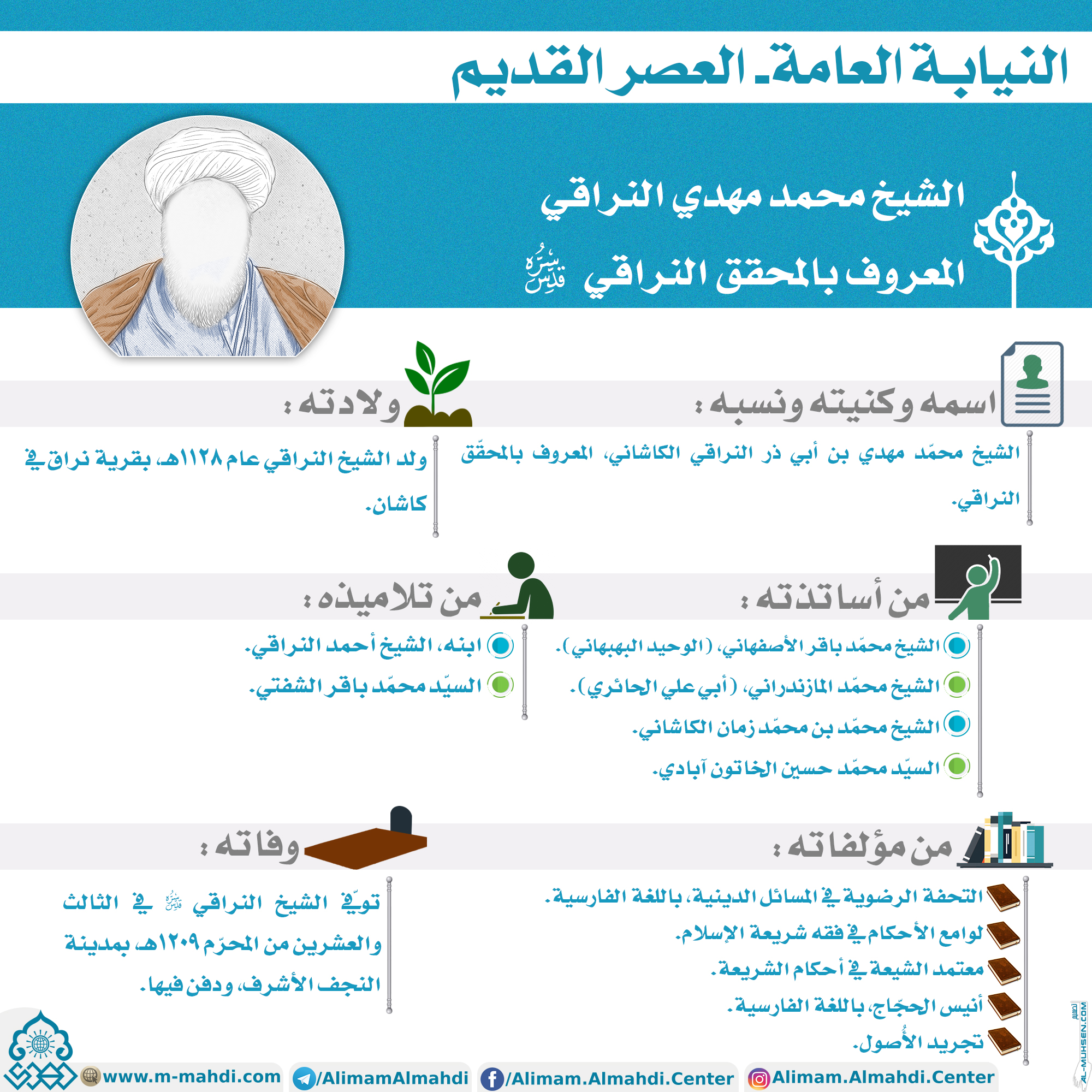 ?الشيخ محمد مهدي النراقي المعروف بالمحقق النراقي (قدس سره) ?اسمه وكنيته ونسبه: الشيخ محمّد مهدي بن أبي ذر النراقي الكاشاني، المعروف بالمحقّق النراقي. ?ولادته: ولد الشيخ النراقي عام ١١٢٨هـ، بقرية نراق في كاشان. ?من أساتذته: - الشيخ محمّد باقر الأصفهاني، (الوحيد البهبهاني). - الشيخ محمّد…
