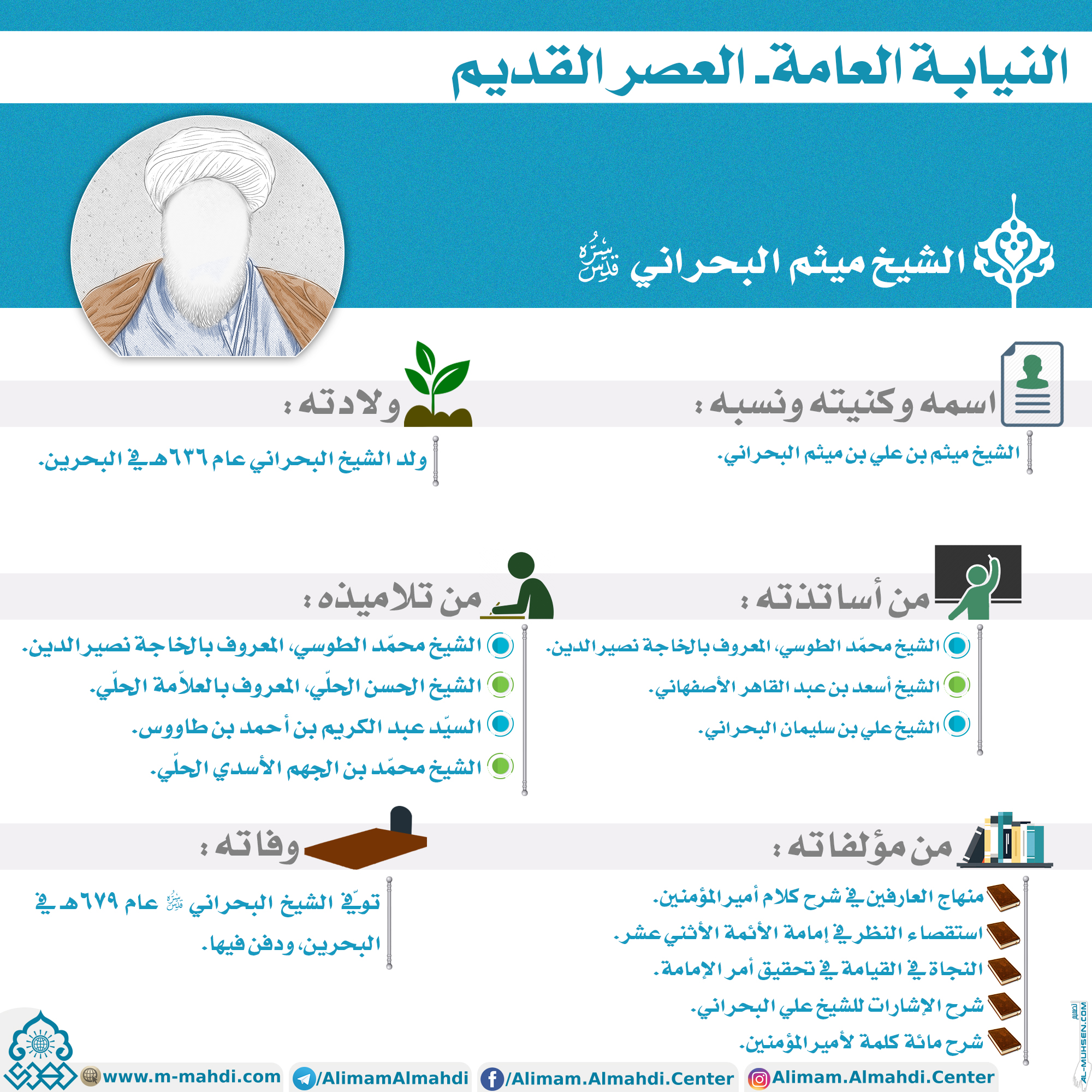 ?الشيخ ميثم البحراني (قدس سره) ?اسمه وكنيته ونسبه: الشيخ ميثم بن علي بن ميثم البحراني. ?ولادته: ولد الشيخ البحراني عام ٦٣٦هـ في البحرين. ?من أساتذته: - الشيخ محمّد الطوسي، المعروف بالخاجة نصير الدين. - الشيخ أسعد بن عبد القاهر الأصفهاني. - الشيخ علي بن سليمان البحراني. ?من تلاميذه: - الشيخ…