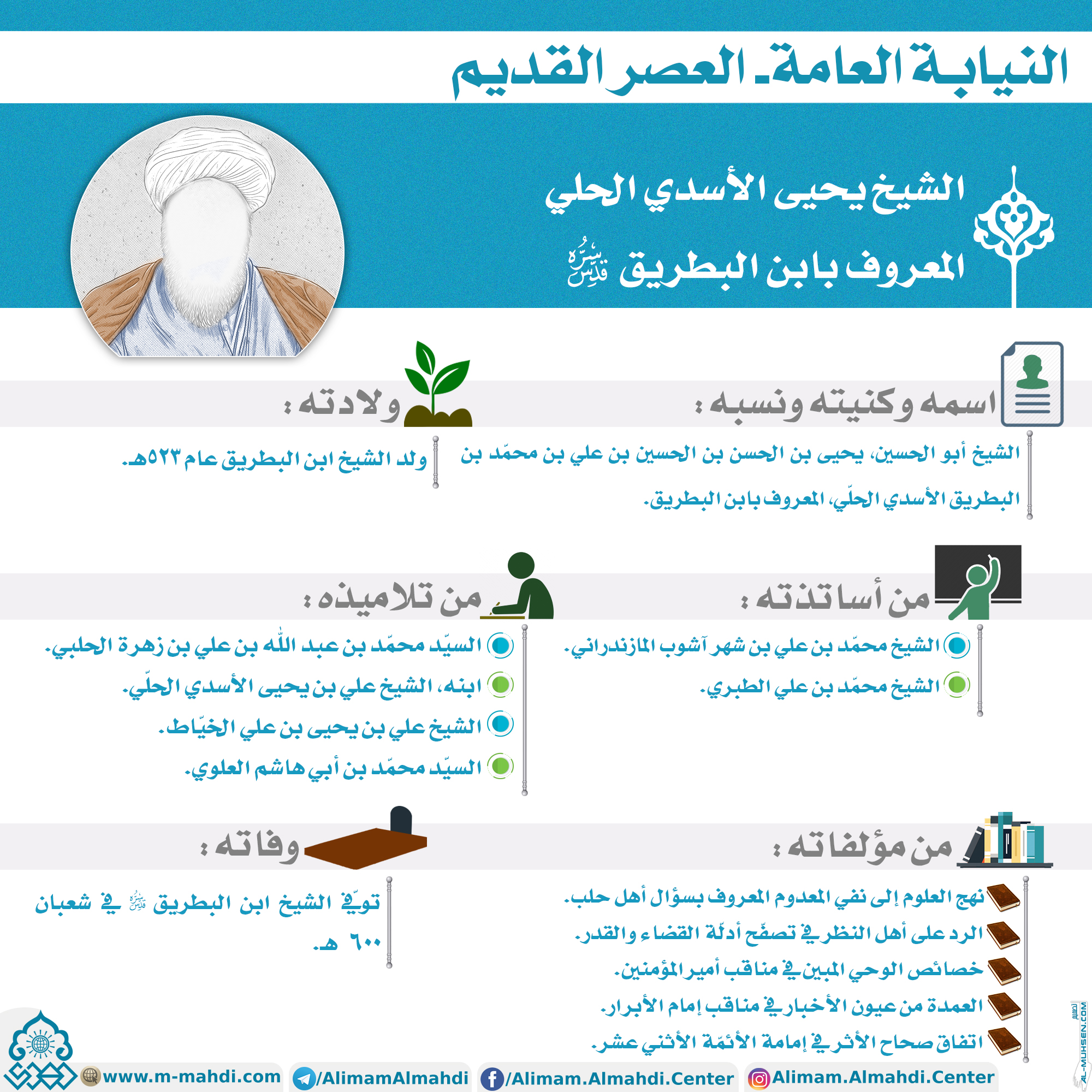 ?الشيخ يحيى الأسدي الحلي المعروف بابن البطريق (قدس سره) ?اسمه وكنيته ونسبه: الشيخ أبو الحسين، يحيى بن الحسن بن الحسين بن علي بن محمّد بن البطريق الأسدي الحلّي، المعروف بابن البطريق. ?ولادته: ولد الشيخ ابن البطريق عام ٥٢٣هـ. ?من أساتذته: - الشيخ محمّد بن علي بن شهر آشوب المازندراني.…