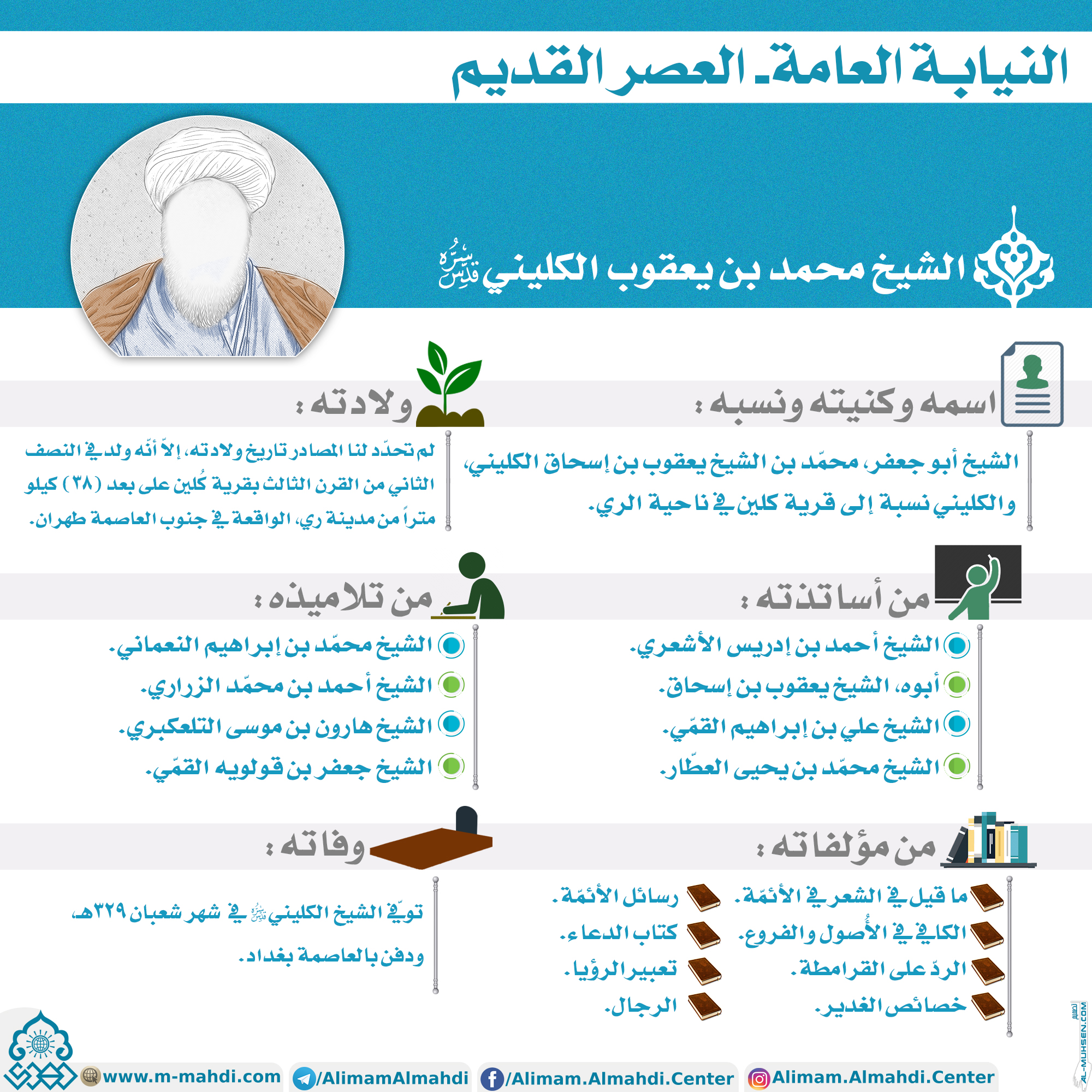 ?الشيخ محمد بن يعقوب الكليني (قدس سره) ?اسمه وكنيته ونسبه: الشيخ أبو جعفر، محمّد بن الشيخ يعقوب بن إسحاق الكليني، والكليني نسبة إلى قرية كلين في ناحية الري. ?ولادته: لم تحدّد لنا المصادر تاريخ ولادته، إلاّ أنّه ولد في النصف الثاني من القرن الثالث بقرية كُلين على بعد (٣٨) كيلو متراً…
