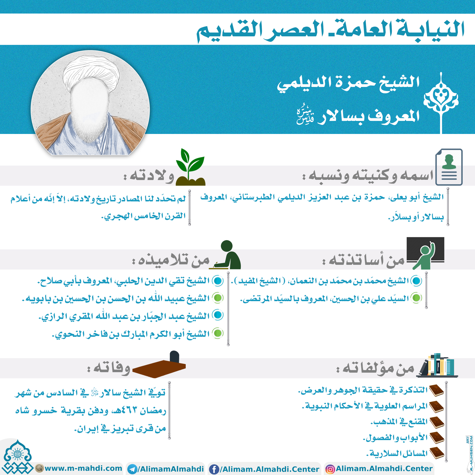 ?الشيخ حمزة الديلمي المعروف بسالار (قدس سره) ?اسمه وكنيته ونسبه: الشيخ أبو يعلى، حمزة بن عبد العزيز الديلمي الطبرستاني، المعروف بسالار أو بسلاّر. ?ولادته: لم تحدّد لنا المصادر تاريخ ولادته، إلاّ إنّه من أعلام القرن الخامس الهجري. ?من أساتذته: - الشيخ محمّد بن محمّد بن النعمان، (الشيخ…