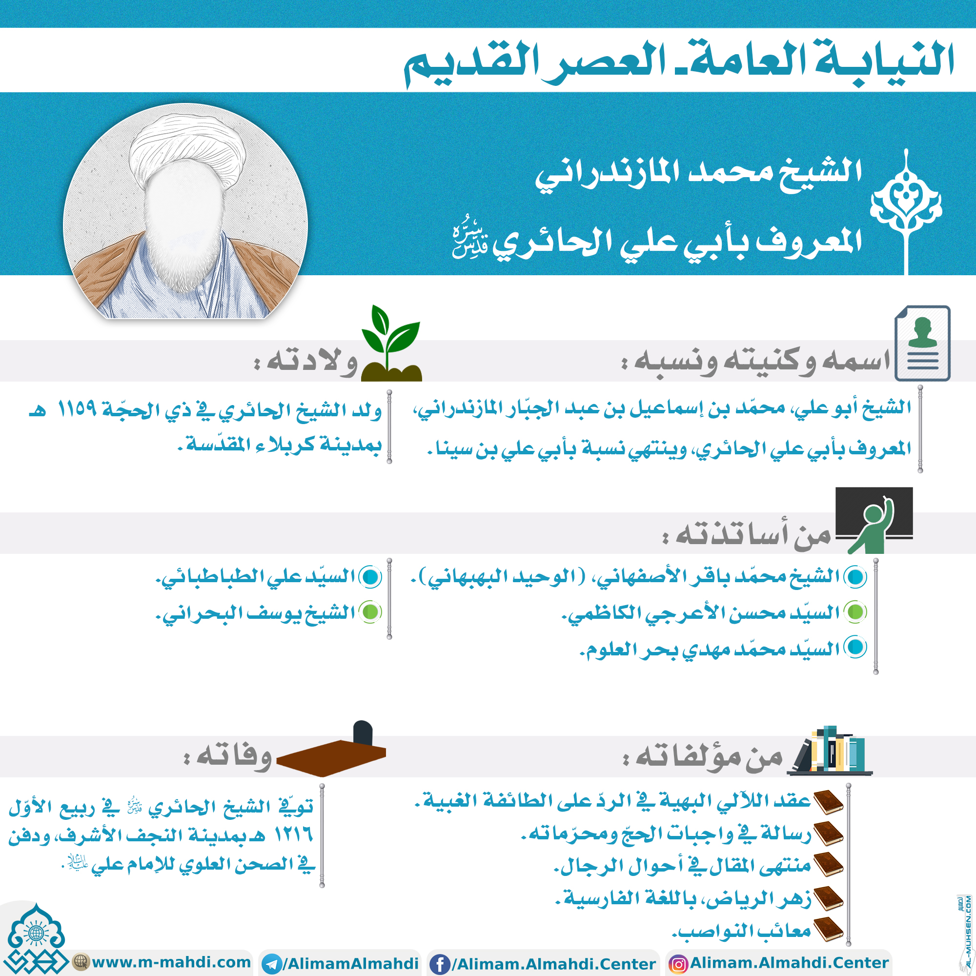 ?الشيخ محمد المازندراني المعروف بأبي علي الحائري (قدس سره) ?اسمه وكنيته ونسبه: الشيخ أبو علي، محمّد بن إسماعيل بن عبد الجبّار المازندراني، المعروف بأبي علي الحائري، وينتهي نسبة بأبي علي بن سينا. ?ولادته: ولد الشيخ الحائري في ذي الحجّة ١١٥٩ هـ بمدينة كربلاء المقدّسة. ?من أساتذته: -…