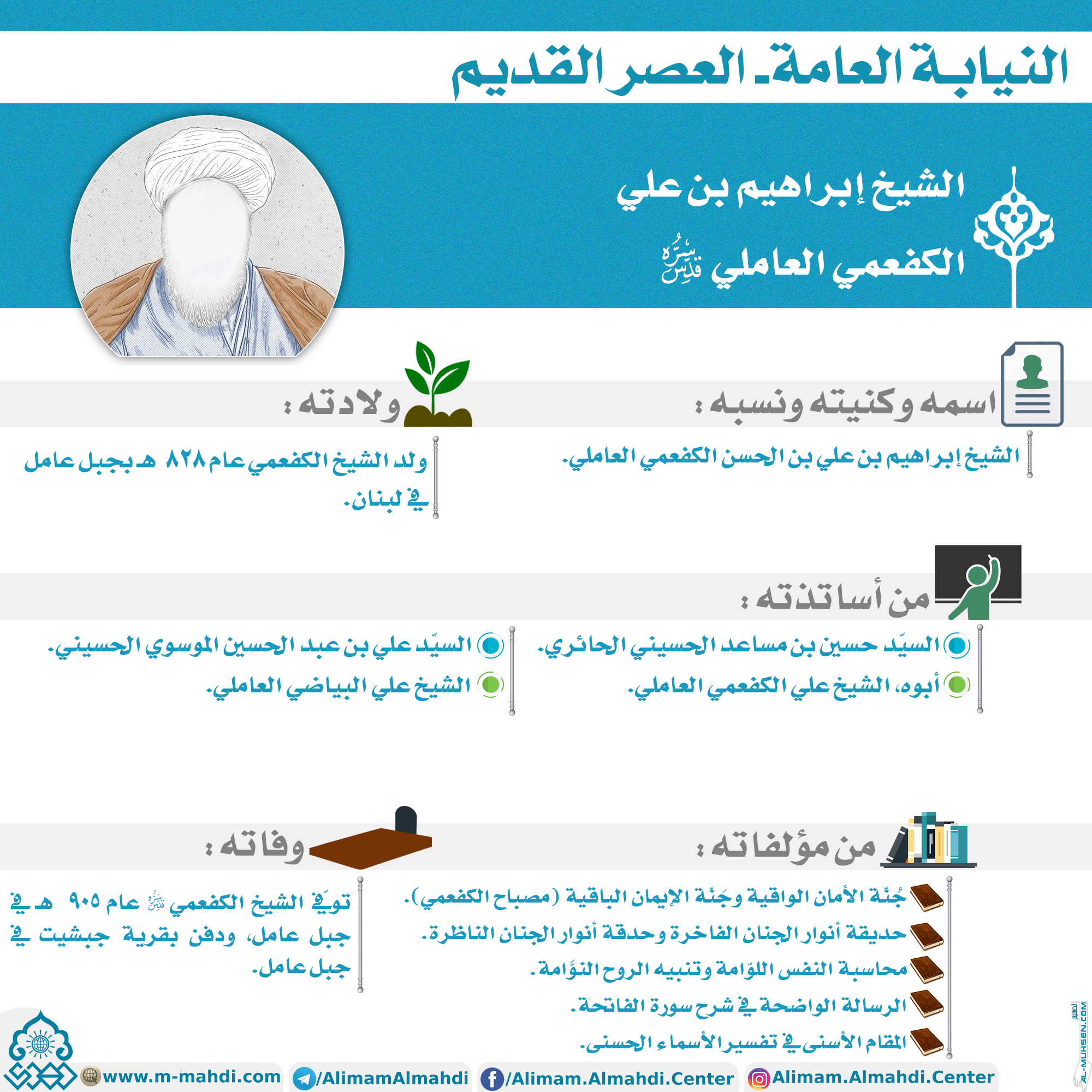?الشيخ إبراهيم بن علي الكفعمي العاملي (قدس سره) ?اسمه وكنيته ونسبه: الشيخ إبراهيم بن علي بن الحسن الكفعمي العاملي. ?ولادته: ولد الشيخ الكفعمي عام ٨٢٨ هـ بجبل عامل في لبنان. ?من أساتذته: - السيّد حسين بن مساعد الحسيني الحائري. - السيّد علي بن عبد الحسين الموسوي الحسيني. - أبوه، الشيخ علي…