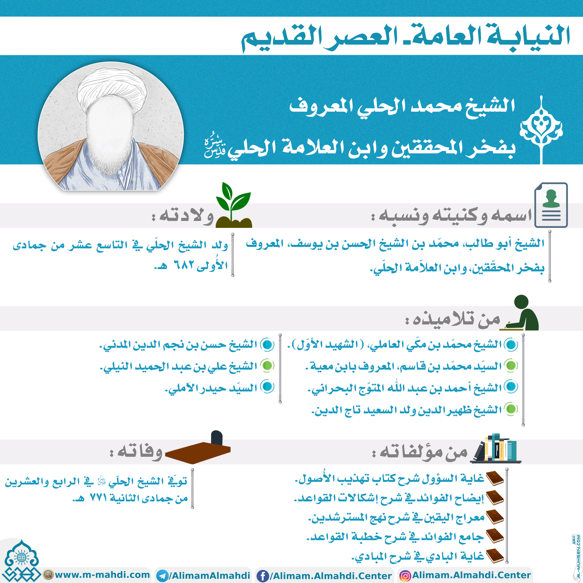 ?الشيخ محمد الحلي المعروف بفخر المحققين وابن العلامة الحلي (قدس سره) ?اسمه وكنيته ونسبه: الشيخ أبو طالب، محمّد بن الشيخ الحسن بن يوسف، المعروف بفخر المحقّقين، وابن العلاّمة الحلّي. ?ولادته: ولد الشيخ الحلّي في التاسع عشر من جمادى الأُولى ٦٨٢ هـ. ?من تلاميذه: - الشيخ محمّد بن مكّي العاملي،…