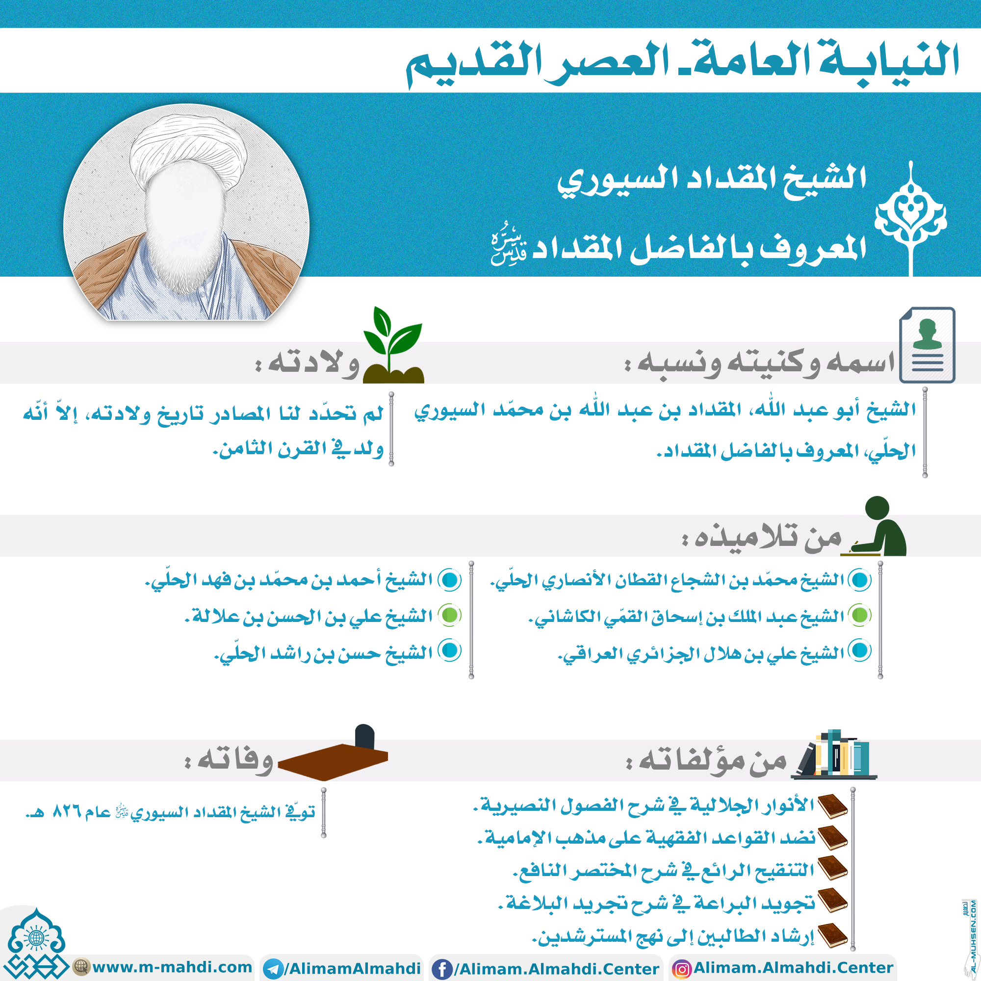 ?الشيخ المقداد السيوري المعروف بالفاضل المقداد (قدس سره) ?اسمه وكنيته ونسبه: الشيخ أبو عبد الله، المقداد بن عبد الله بن محمّد السيوري الحلّي، المعروف بالفاضل المقداد. ?ولادته: لم تحدّد لنا المصادر تاريخ ولادته، إلاّ أنّه ولد في القرن الثامن. ?من تلاميذه: - الشيخ محمّد بن الشجاع القطان…