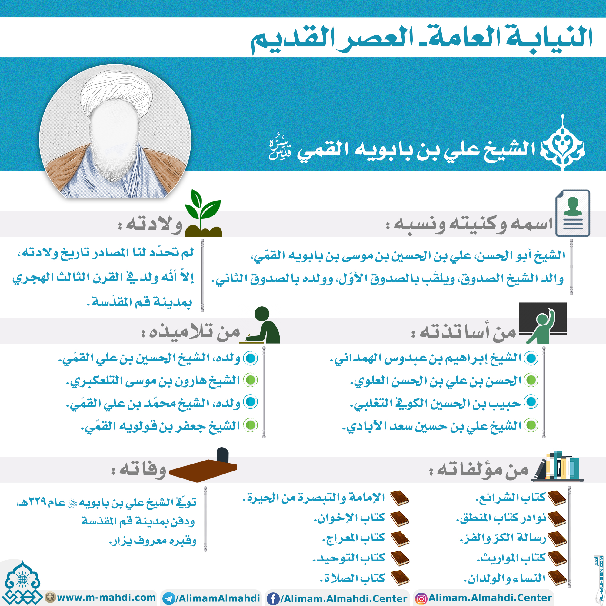 ?الشيخ علي بن بابويه القمي (قدس سره) ?اسمه وكنيته ونسبه: الشيخ أبو الحسن، علي بن الحسين بن موسى بن بابويه القمّي، والد الشيخ الصدوق، ويلقّب بالصدوق الأوّل، وولده بالصدوق الثاني. ?ولادته: لم تحدّد لنا المصادر تاريخ ولادته، إلاّ أنّه ولد في القرن الثالث الهجري بمدينة قم المقدّسة.…