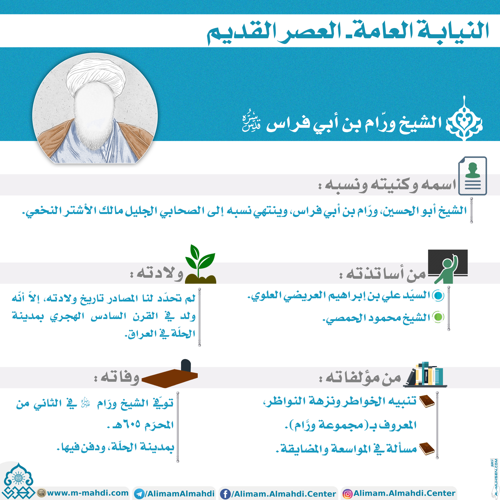 ?الشيخ ورّام بن أبي فراس (قدس سره) ?اسمه وكنيته ونسبه: الشيخ أبو الحسين، ورّام بن أبي فراس، وينتهي نسبه إلى الصحابي الجليل مالك الأشتر النخعي. ?ولادته: لم تحدّد لنا المصادر تاريخ ولادته، إلاّ أنّه ولد في القرن السادس الهجري بمدينة الحلّة في العراق. ?من أساتذته: - السيّد علي بن إبراهيم…