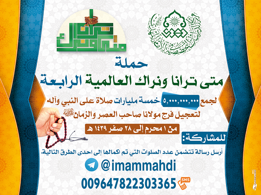مع اطلالة شهر الأحزان والوفاء يطلق مركز الدراسات التخصصية في الإمام المهدي عليه السلام حملة (متى ترانا ونراك) العالمية الرابعةلجمع خمسة مليارات صلوات على النبي وآله من اليوم الأول من شهر محرم الحرام الى يوم ٢٨ صفر الخير لسنة ١٤٣٩ للهجرة