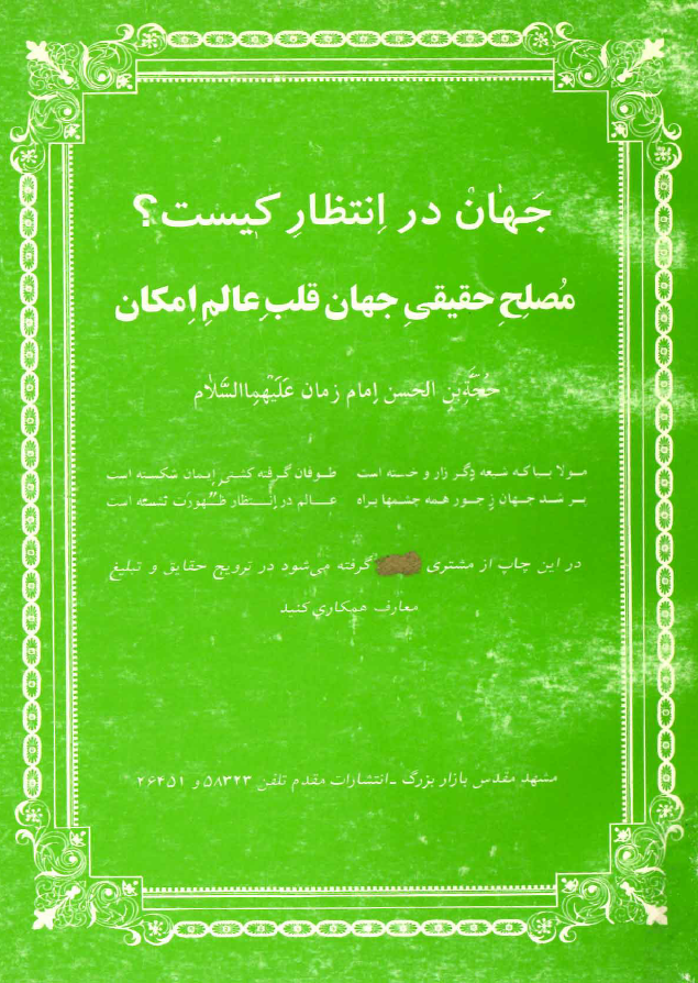 به نام خداوند بخشنده مهربان بار الها: ولی امرت امام زمان حجت بن الحسن را که درودهایت بر او وپدرانش باد در این هنگام وبرای همیشه سرپرست ونگهدار ورهبر ویاور وراهنما ونگاهبان باش تا گیتی را به فرمان او آوری وتا دیر زمان، بهره مندش گردانی | اَللّـهُمَّ کنْ لِوَلِیک الْحُجَّةِ بْنِ الْحَسَنِ صَلَواتُک عَلَیهِ وَعَلی آبائِه فی هذِهِ السَّاعَةِ وَفی کلِّ ساعَة وَلِیاً وَحافِظاً وَقائِداً وَناصِراً وَدَلیلاً وَعَیناً حَتّی تُسْکنَهُ اَرْضَک طَوْعاً وَتُمَتِّعَهُ فیها طَویلاً