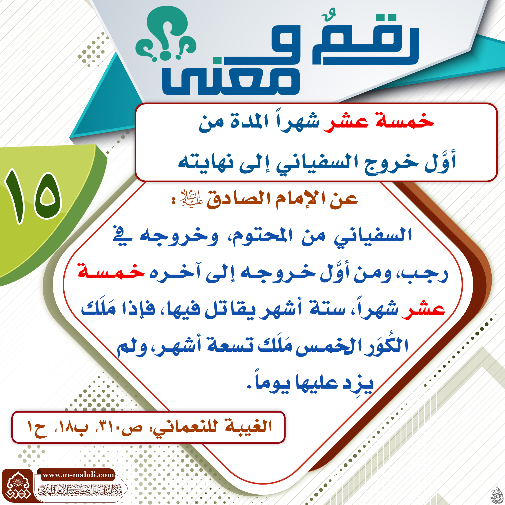 ? خمسة عشر شهراً المدة من أوَّل خروج السفياني إلى نهايته. ـ?١٥ ? عن الإمام الصادق (عليه السلام): السفياني من المحتوم، وخروجه في رجـب، ومـن أوَّل خـروجـه إلى آخــره خـمـسـة عشر شهراً، ستة أشهر يقاتل فيها، فإذا مَلَك الكُوَر الخمـس مَلَك تسعة أشهـر، ولم يزِد عليها يوماً. ? الغيبة للنعماني:…