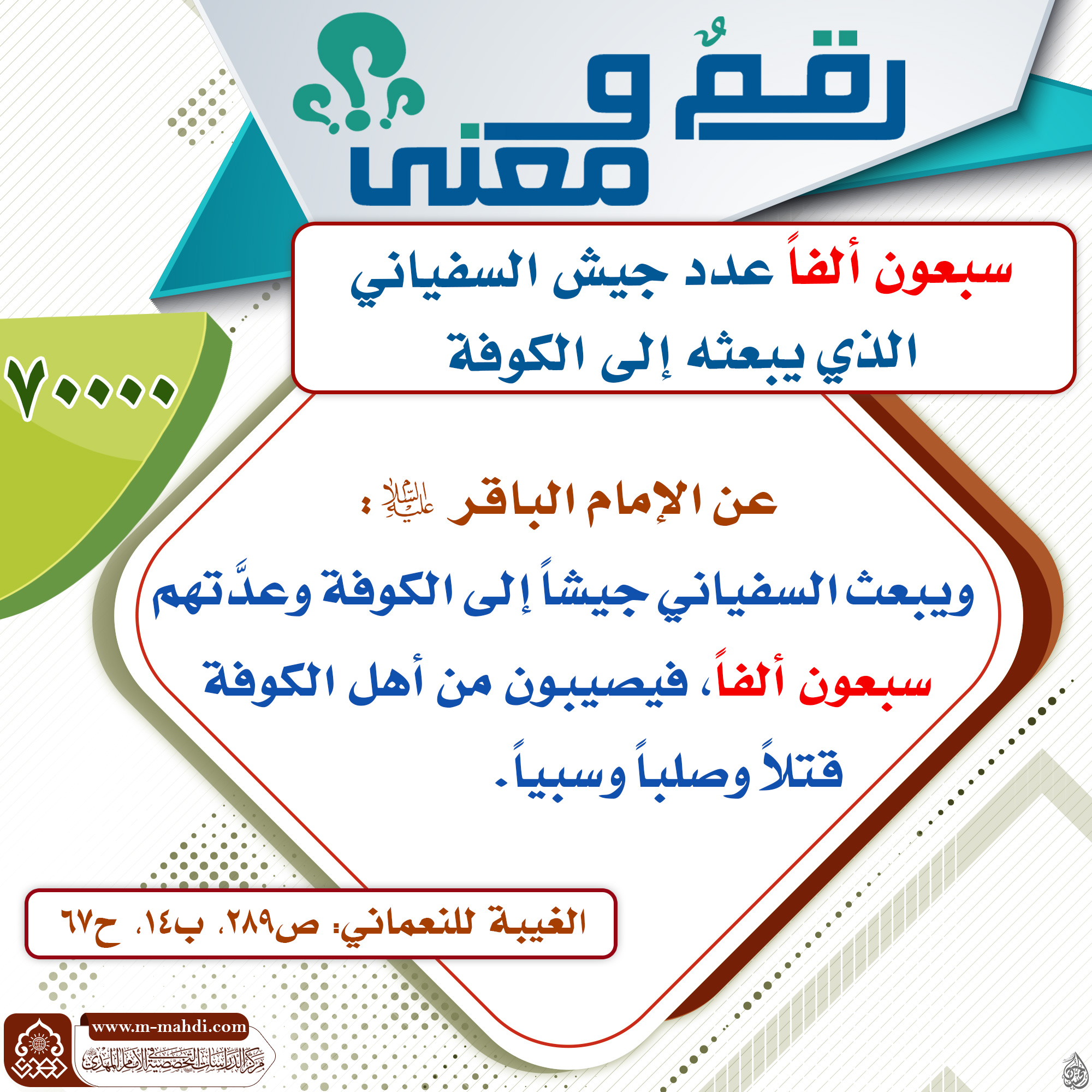? سبعون ألفاً عدد جيش السفياني الذي يبعثه إلى الكوفة. ـ?٧٠٠٠٠ ? عن الإمام الباقر (عليه السلام): ويبعث السفياني جيشاً إلى الكوفة وعدَّتهم سبعون ألفاً، فيصيبون من أهل الكوفة قتلاً وصلباً وسبياً. ? الغيبة للنعماني: ص٢٨٩، ب١٤، ح٦٧