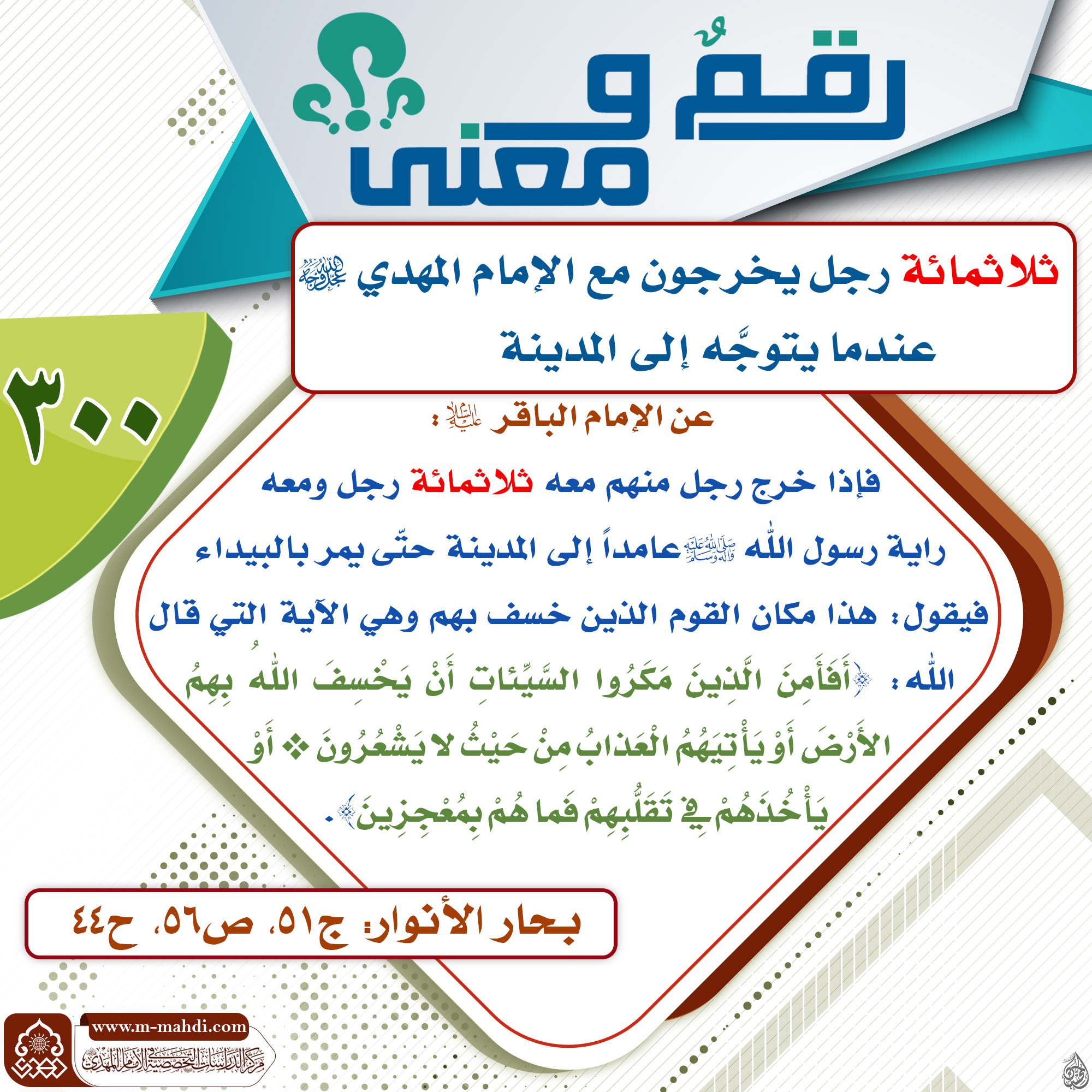 ? ثلاثمائة رجل يخرجون مع الإمام المهدي (عجّل الله فرجه) عندما يتوجَّه إلى المدينة. ـ?٣٠٠ ? عن الإمام الباقر (عليه السلام): فإذا خرج رجل منهم معه ثلاثمائة رجل ومعه راية رسول الله (صلّى الله عليه وآله وسلم) عامداً إلى المدينة حتّى يمر بالبيداء فيقول: هذا مكان القوم الذين خسف بهم وهي الآية…
