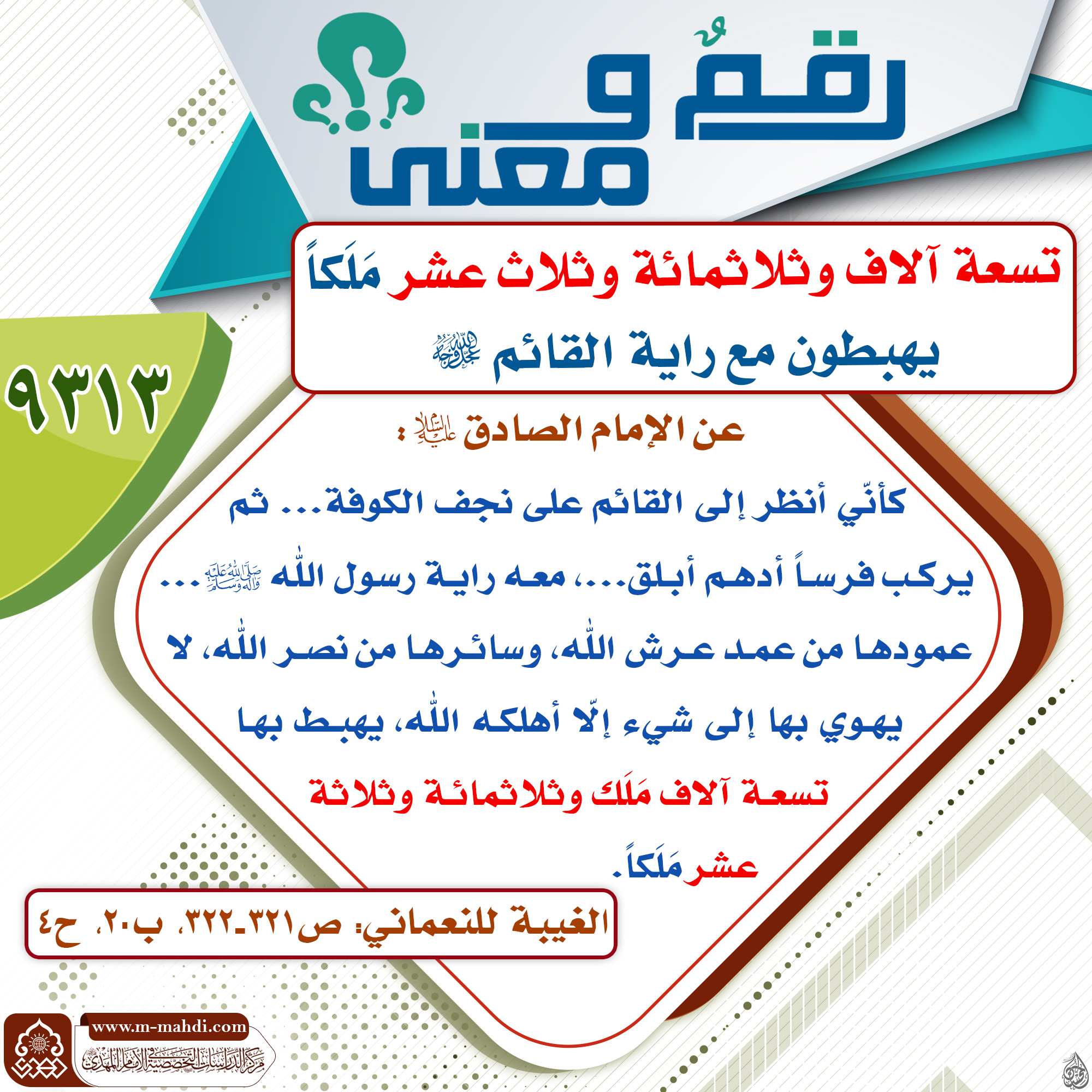 ? تسعة آلاف وثلاثمائة وثلاث عشر مَلَكاً يهبطون مع راية القائم (عجّل الله فرجه). ـ?٩٣١٣ ? عن الإمام الصادق (عليه السلام): كأنّي أنظر إلى القائم على نجف الكوفة... ثم يركـب فرسـاً أدهـم أبـلق...، معـه رايـة رسول الله (صلّى الله عليه وآله وسلم)... عمودهـا من عمـد عـرش الله، وسائـرهـا من نصـر…