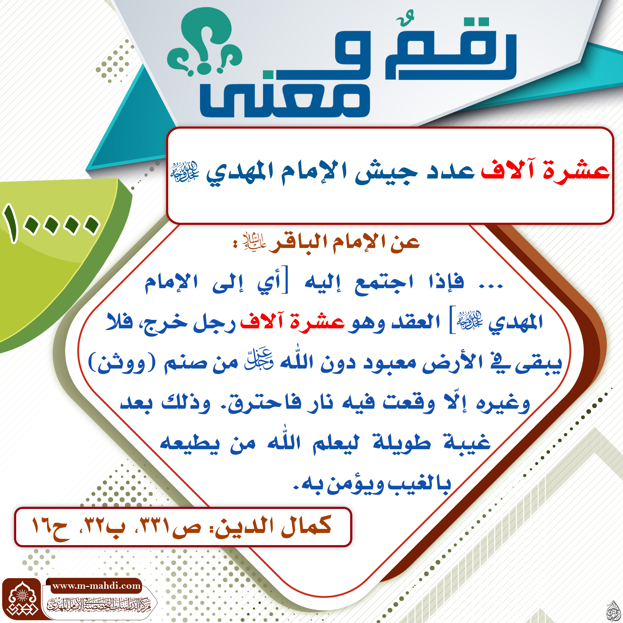? عشرة آلاف عدد جيش الإمام المهدي (عجّل الله فرجه). ـ?١٠٠٠٠ ? عن الإمام الباقر (عليه السلام): ... فإذا اجتمع إليه [أي إلى الإمام المهدي (عجّل الله فرجه)] العقد وهو عشرة آلاف رجل خرج، فلا يبقى في الأرض معبود دون الله (عزّ وجل) من صنم (ووثن) وغيره إلّا وقعت فيه نار فاحترق. وذلك بعد غيبة طويلة…
