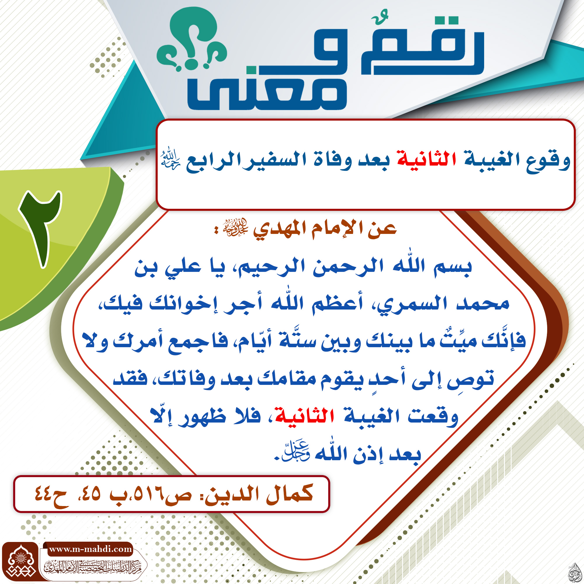 ? وقوع الغيبة الثانية بعد وفاة السفير الرابع (رحمه الله). ـ?٢ ? عن الإمام المهدي (عجّل الله فرجه): بسم الله الرحمن الرحيم، يا علي بن محمد السمري، أعظم الله أجر إخوانك فيك، فإنَّك ميِّتٌ ما بينك وبين ستَّة أيّام، فاجمع أمرك ولا توصِ إلى أحدٍ يقوم مقامك بعد وفاتك، فقد وقعت الغيبة الثانية،…