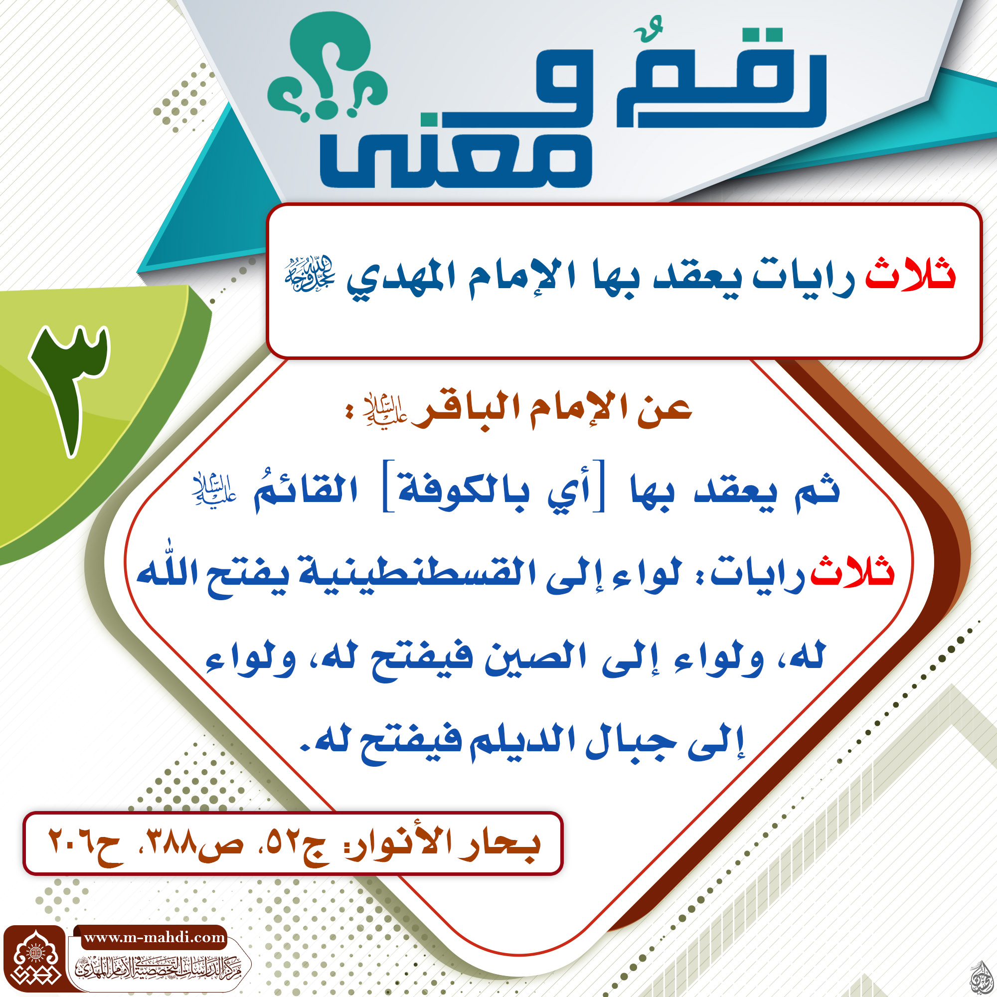 ? ثلاث رايات يعقد بها الإمام المهدي (عجّل الله فرجه). ـ?٣ ? عن الإمام الباقر (عليه السلام): ثم يعقد بها [أي بالكوفة] القائمُ (عليه السلام) ثلاث رايات: لواء إلى القسطنطينية يفتح الله له، ولواء إلى الصين فيفتح له، ولواء إلى جبال الديلم فيفتح له. ? بحار الأنوار: ج٥٢، ص٣٨٨، ح٢٠٦