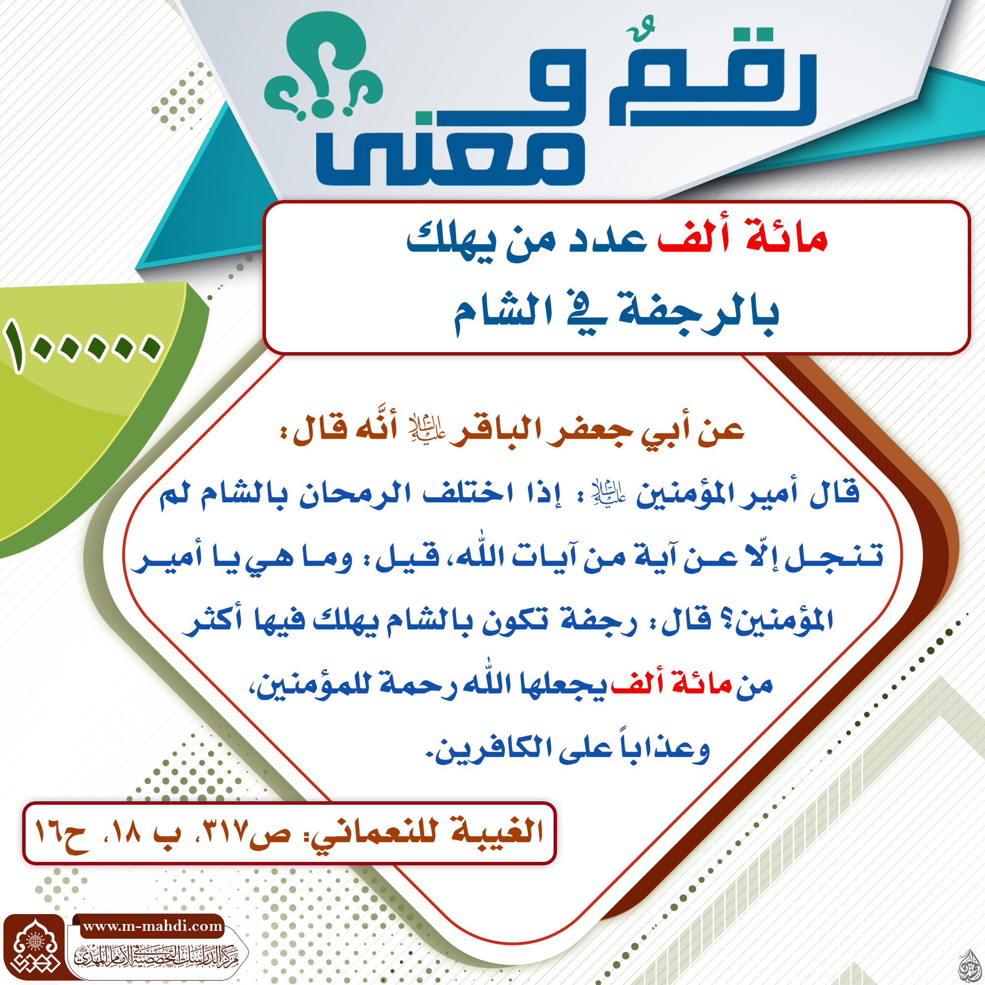 ? مائة ألف جبّار يقتل في معركة قرقيسياء. ـ?١٠٠٠٠٠ ? عن أبي جعفر الباقر (عليه السلام) أنَّه قال: قال أمير المؤمنين (عليه السلام): إذا اختلف الرمحان بالشام لم تـنـجــل إلّا عــن آية مـن آيـات الله، قـيـل: ومــا هـي يـا أميــر المؤمنين؟ قال: رجفة تكون بالشام يهلك فيها أكثر من مائة ألف يجعلها…