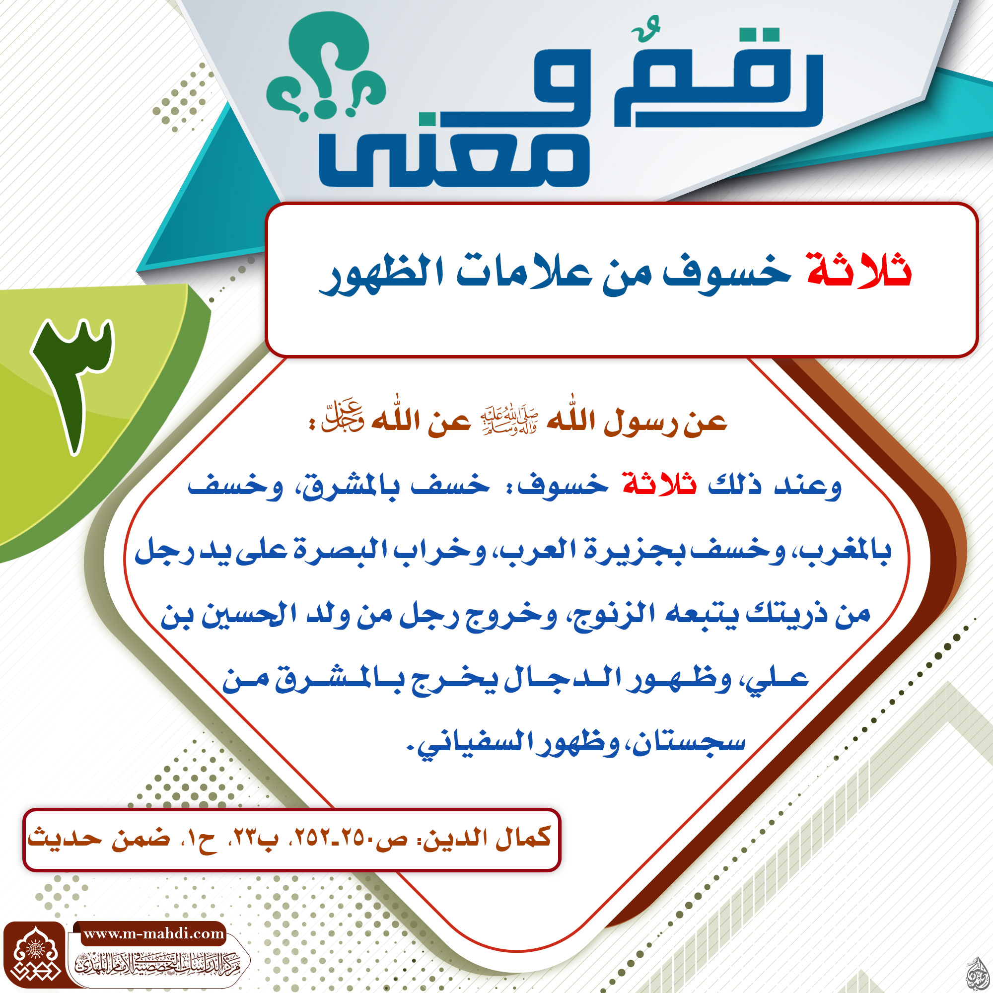 ? ثلاثة خسوف من علامات الظهور. ـ?٣ ? عن رسول الله (صلّى الله عليه وآله وسلم) عن الله (عزّ وجل): وعند ذلك ثلاثة خسوف: خسف بالمشرق، وخسف بالمغرب، وخسف بجزيرة العرب، وخراب البصرة على يد رجل من ذريتك يتبعه الزنوج، وخروج رجل من ولد الحسين بن عــلي، وظــهــور الــدجــال يخــرج بــالمــشــرق…