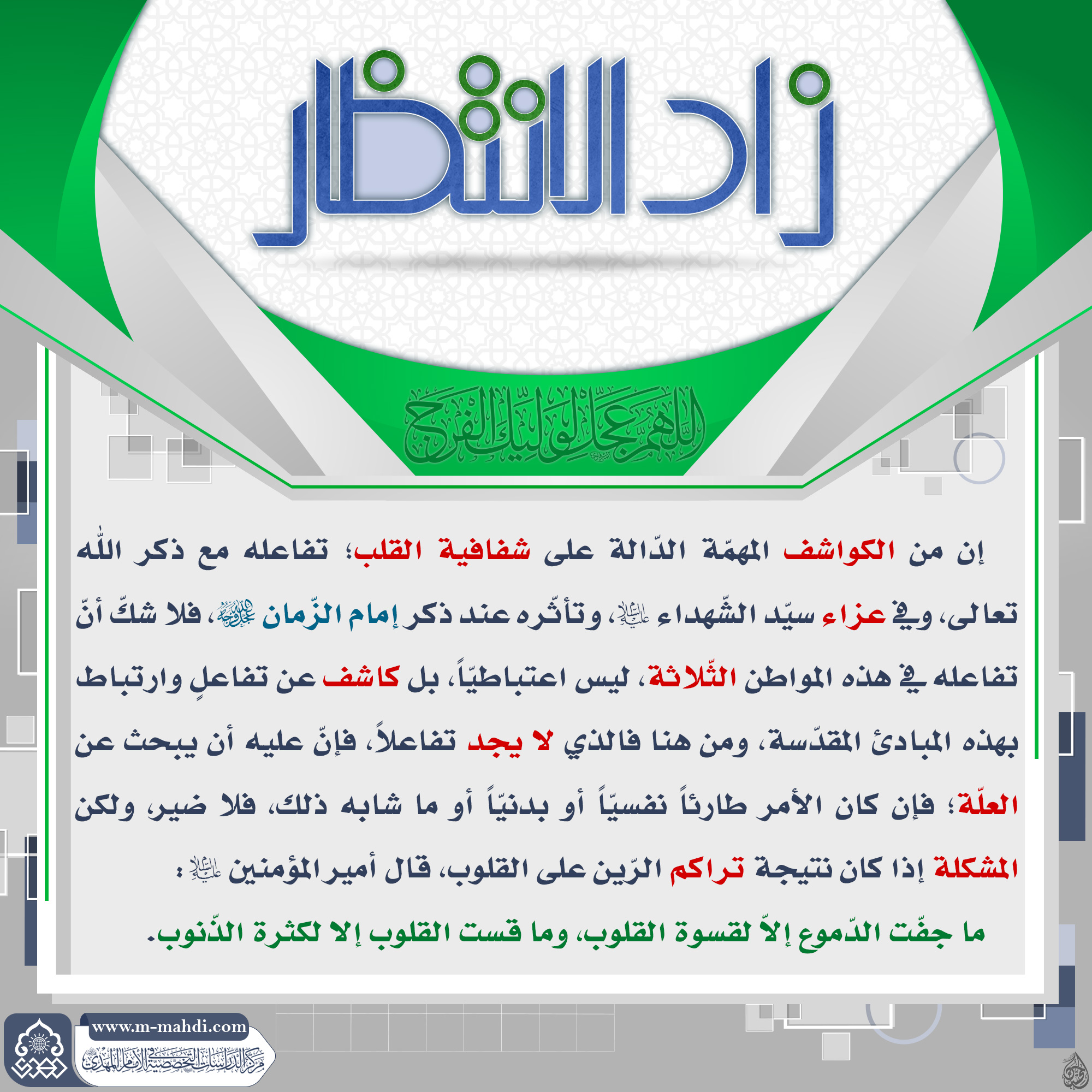 اَللّـهُمَّ كُنْ لِوَلِيِّكَ الْحُجَّةِ بْنِ الْحَسَنِ صَلَواتُكَ عَلَيْهِ وَعَلى آبائِه في هذِهِ السَّاعَةِ وَفي كُلِّ ساعَة وَلِيّاً وَحافِظاً وَقائِداً وَناصِراً وَدَليلاً وَعَيْنا حَتّى تُسْكِنَهُ اَرْضَكَ طَوْعاً وَتُمَتِّعَهُ فيها طَويلاً