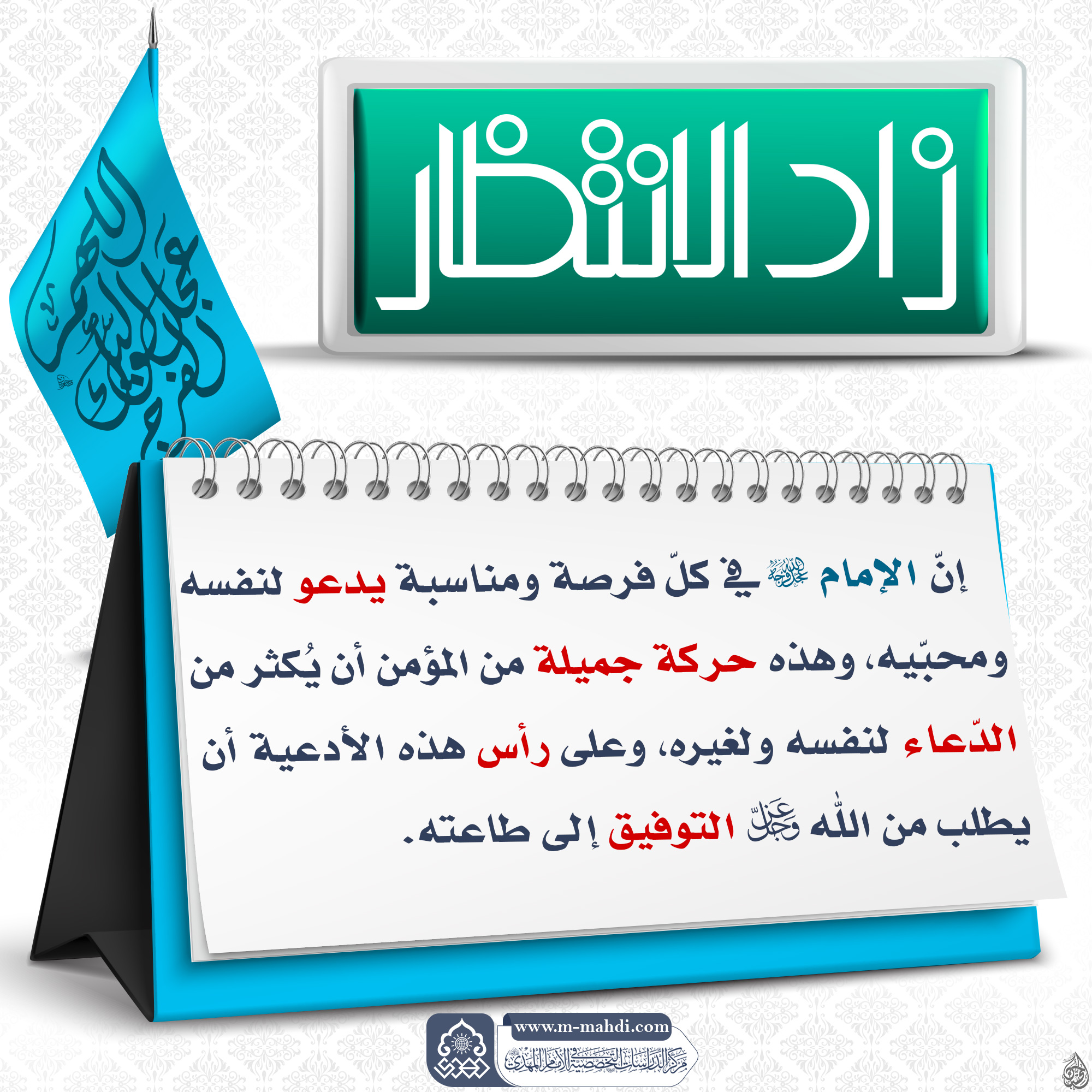 اَللّـهُمَّ كُنْ لِوَلِيِّكَ الْحُجَّةِ بْنِ الْحَسَنِ صَلَواتُكَ عَلَيْهِ وَعَلى آبائِه في هذِهِ السَّاعَةِ وَفي كُلِّ ساعَة وَلِيّاً وَحافِظاً وَقائِداً وَناصِراً وَدَليلاً وَعَيْنا حَتّى تُسْكِنَهُ اَرْضَكَ طَوْعاً وَتُمَتِّعَهُ فيها طَويلاً