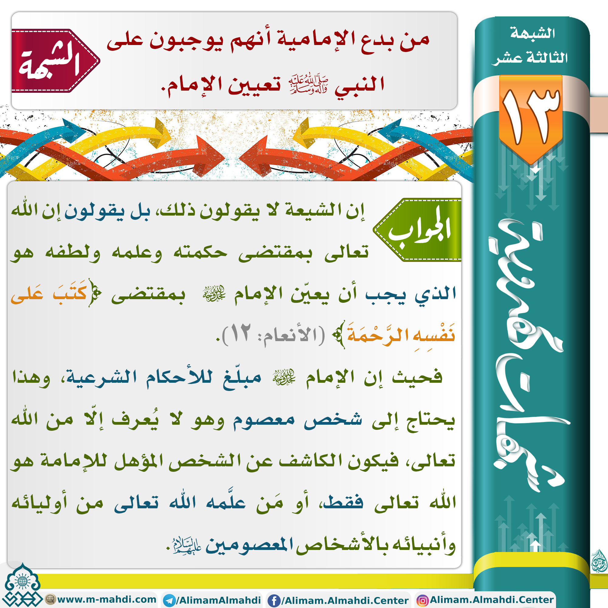 الشيخ حميد عبد الجليل الوائلي الشبهة الثالثة عشر ?الشبهة: ? من بدع الإمامية أنهم يوجبون على النبي (صلّى الله عليه وآله وسلم) تعيين الإمام. ?الجواب: ? إن الشيعة لا يقولون ذلك، بل يقولون إن الله تعالى بمقتضى حكمته وعلمه ولطفه هو الذي يجب أن يعيّن الإمام (عجّل الله فرجه) بمقتضى ﴿كَتَبَ…