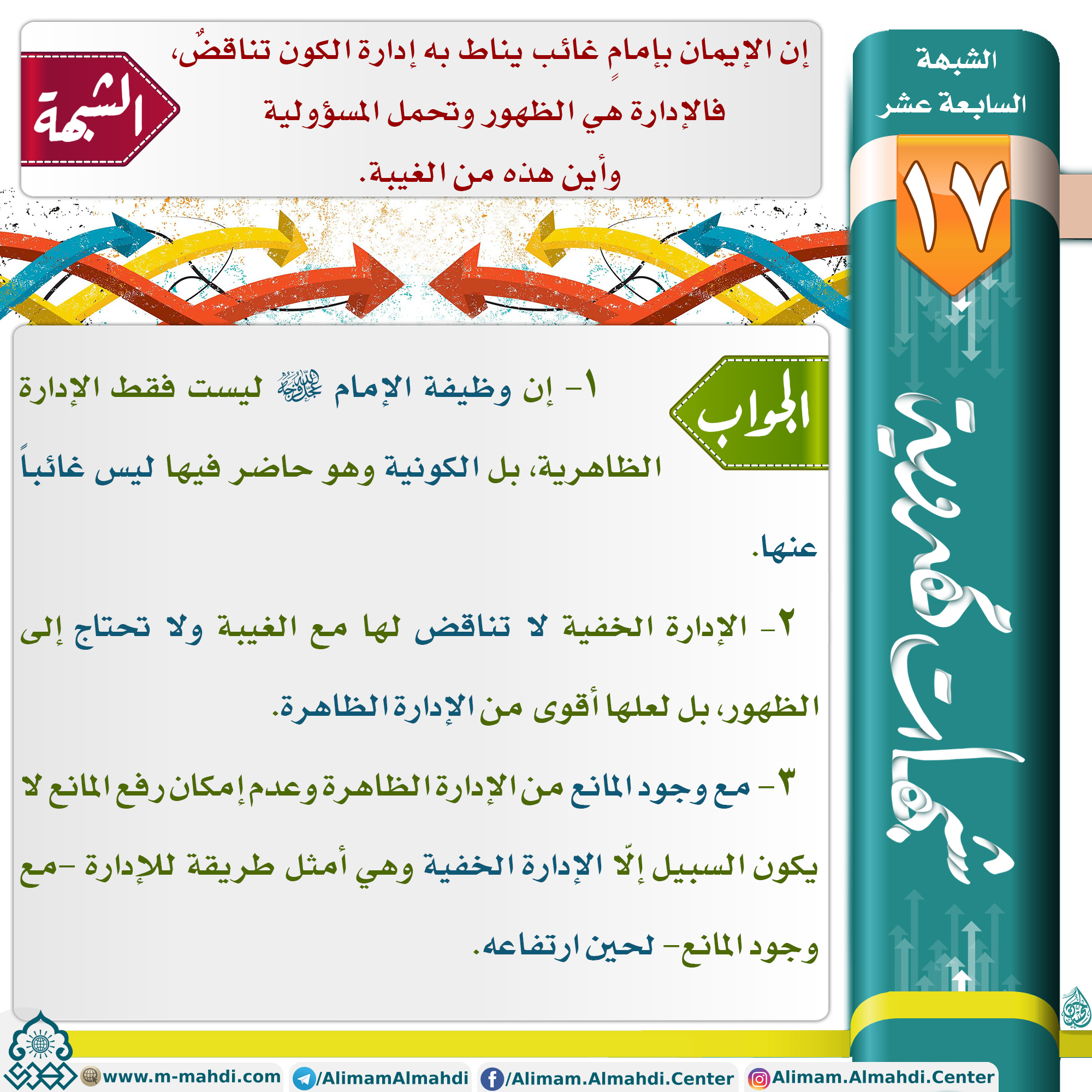 الشيخ حميد عبد الجليل الوائلي الشبهة السابعة عشر ?الشبهة: ? إن الإيمان بإمامٍ غائب يناط به إدارة الكون تناقضٌ، فالإدارة هي الظهور وتحمل المسؤولية وأين هذه من الغيبة. ?الجواب: ? ١– إن وظيفة الإمام (عجّل الله فرجه) ليست فقط الإدارة الظاهرية، بل الكونية وهو حاضر فيها ليس غائباً عنها.…