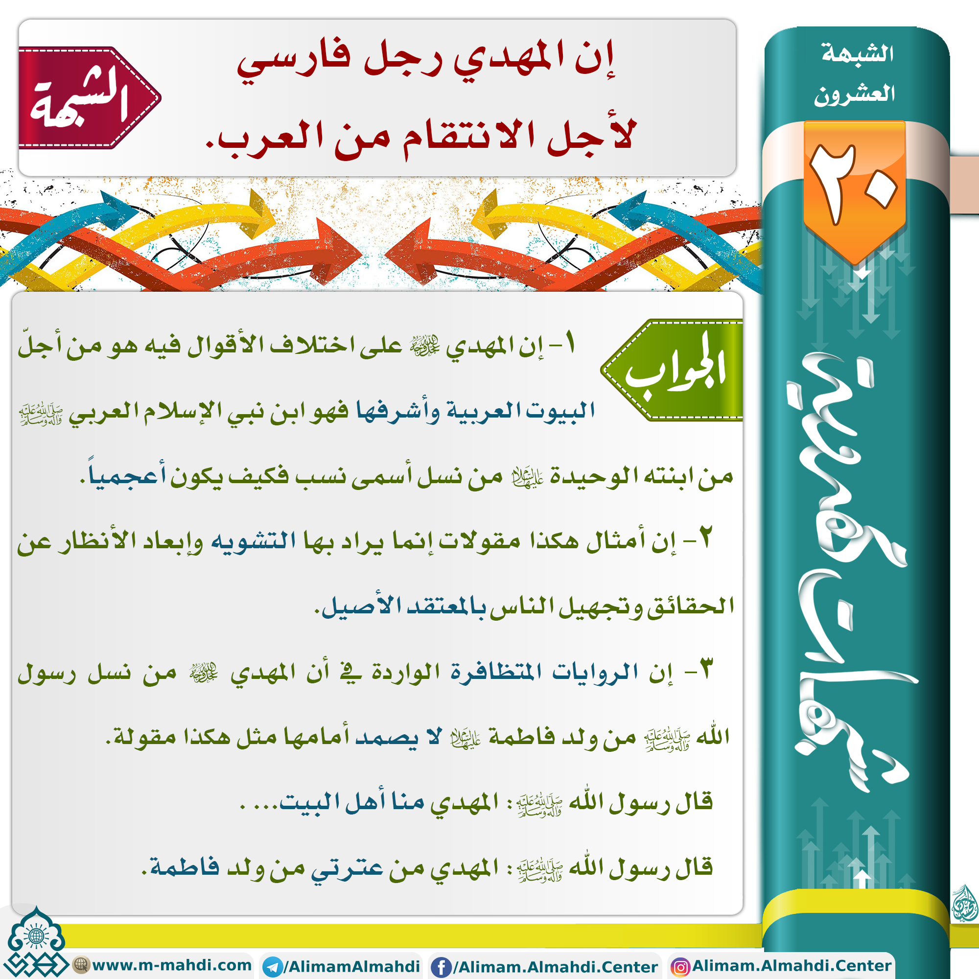 الشيخ حميد عبد الجليل الوائلي الشبهة العشرون ?الشبهة: ? إن المهدي رجل فارسي لأجل الانتقام من العرب. ?الجواب: ? ١– إن المهدي (عجّل الله فرجه) على اختلاف الأقوال فيه هو من أجلّ البيوت العربية وأشرفها فهو ابن نبي الإسلام العربي (صلّى الله عليه وآله وسلم) من ابنته الوحيدة (عليها السلام)…