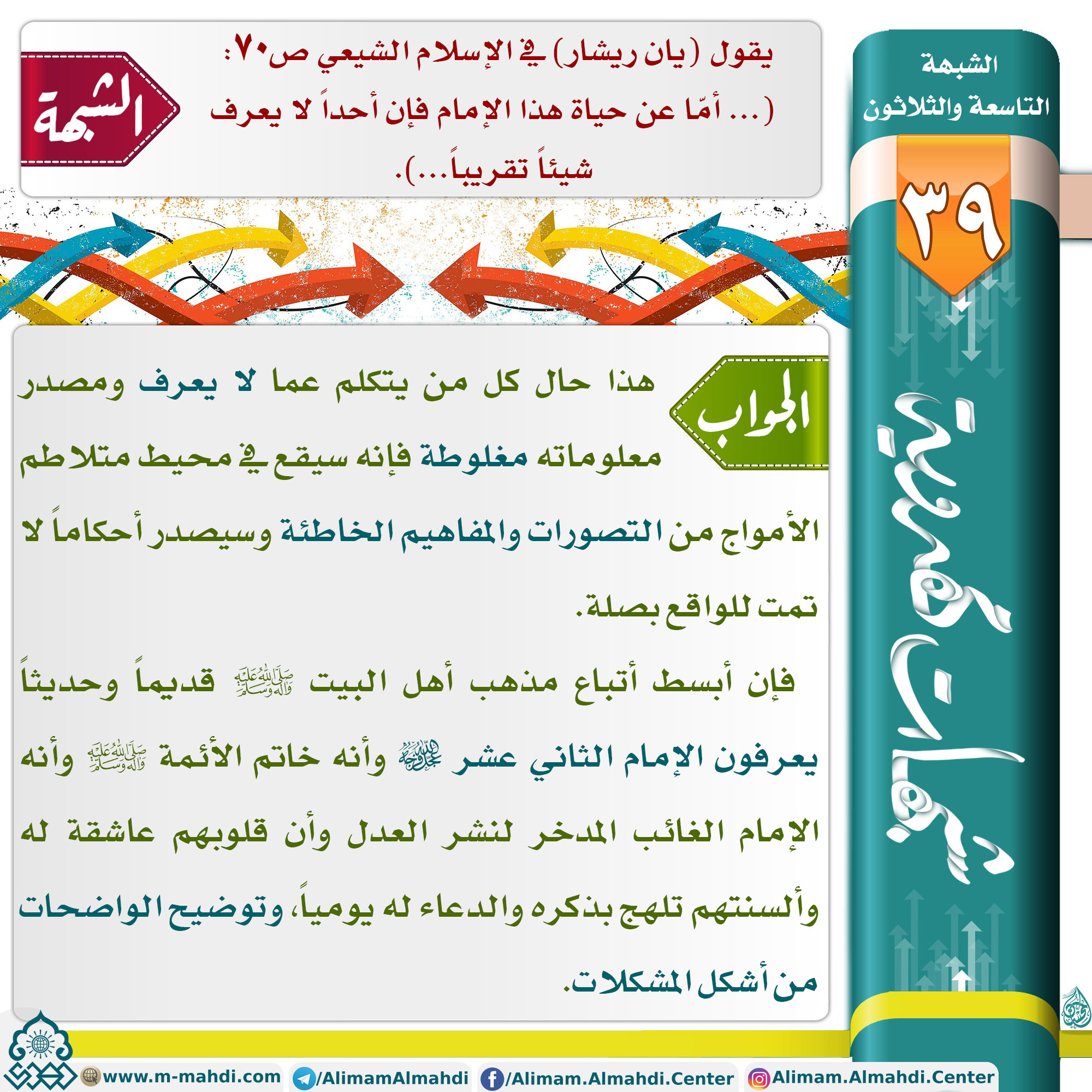 الشيخ حميد عبد الجليل الوائلي الشبهة التاسعة والثلاثون ?الشبهة: ? يقول (يان ريشار) في الإسلام الشيعي ص٧٠: (... أمّا عن حياة هذا الإمام فإن أحداً لا يعرف شيئاً تقريباً...). ?الجواب: ? هذا حال كل من يتكلم عما لا يعرف ومصدر معلوماته مغلوطة فإنه سيقع في محيط متلاطم الأمواج من التصورات والمفاهيم…